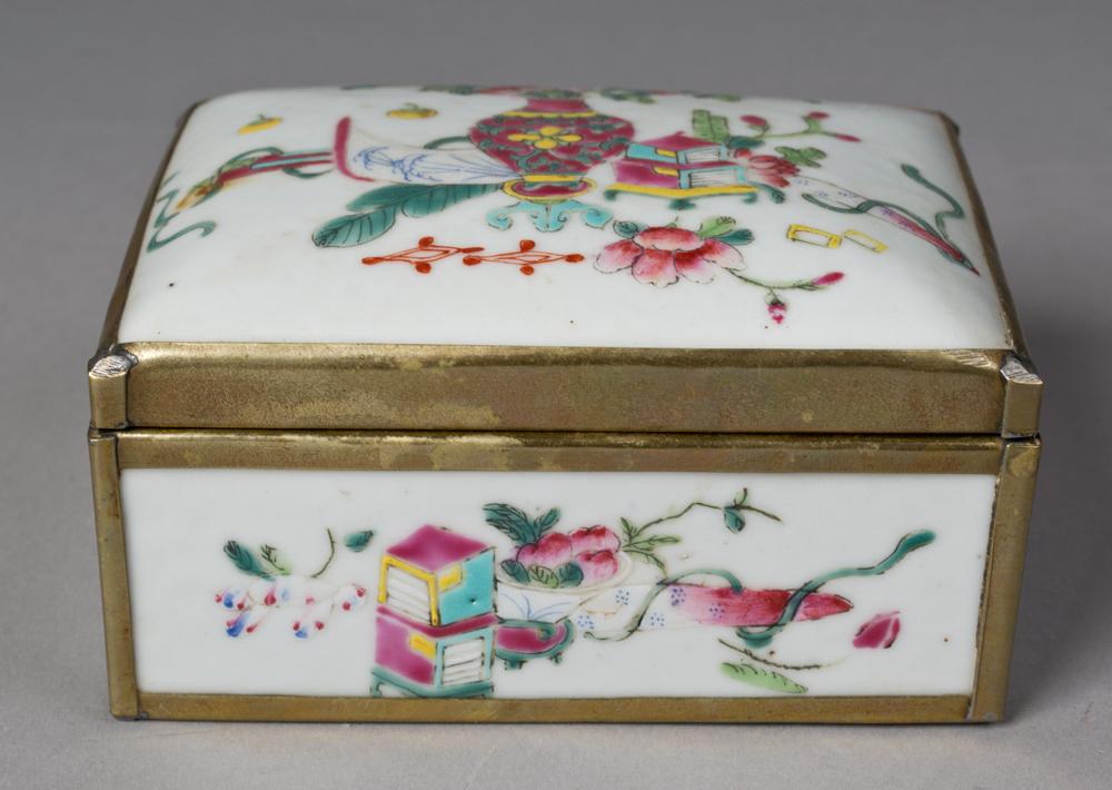 Painted to depict antiques, peaches and cherry blossoms, china mark to base 4.75" w 2.5"H x 3.5D circa late 19th to early 20th century.