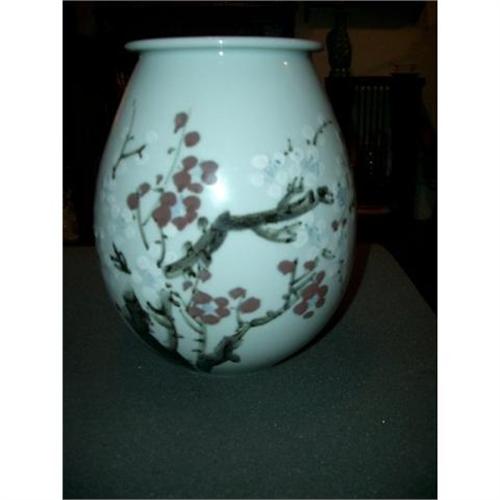 Stunning Korean celadon porcelain vase, 20th century. Elegant form with hand painted trees &leaves.sea-green ground, resting on broad footrim with slightly recessed base. Signed/stamped on underside. Very good condition. Dimensions: 9.5? high, 7? diameter (at widest).