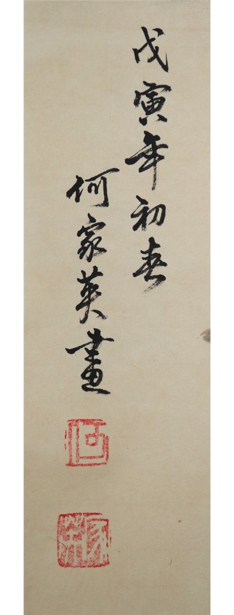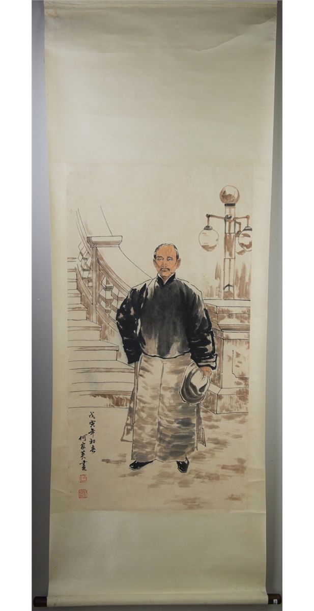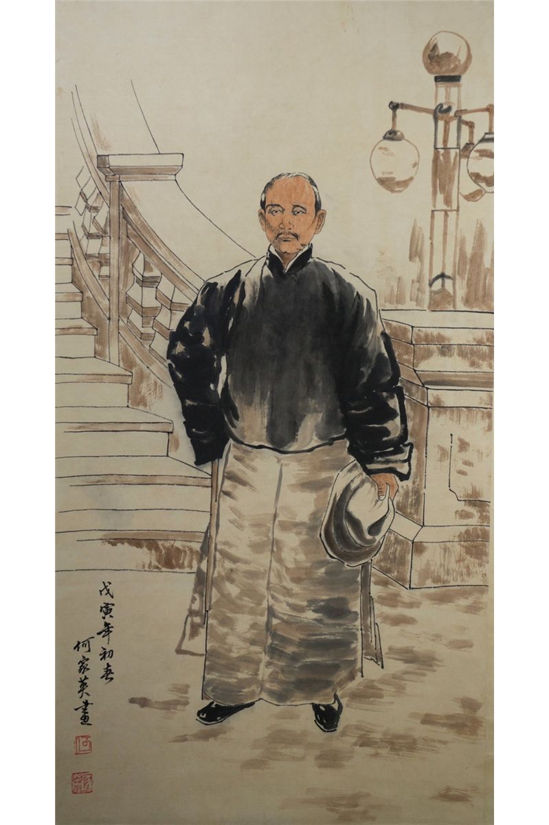 Portrait of man, hanging scroll, Chinese ink and watercolour on paper, signed He Jiaying (1957-) with two real seals. 114 cm x 61 cm.