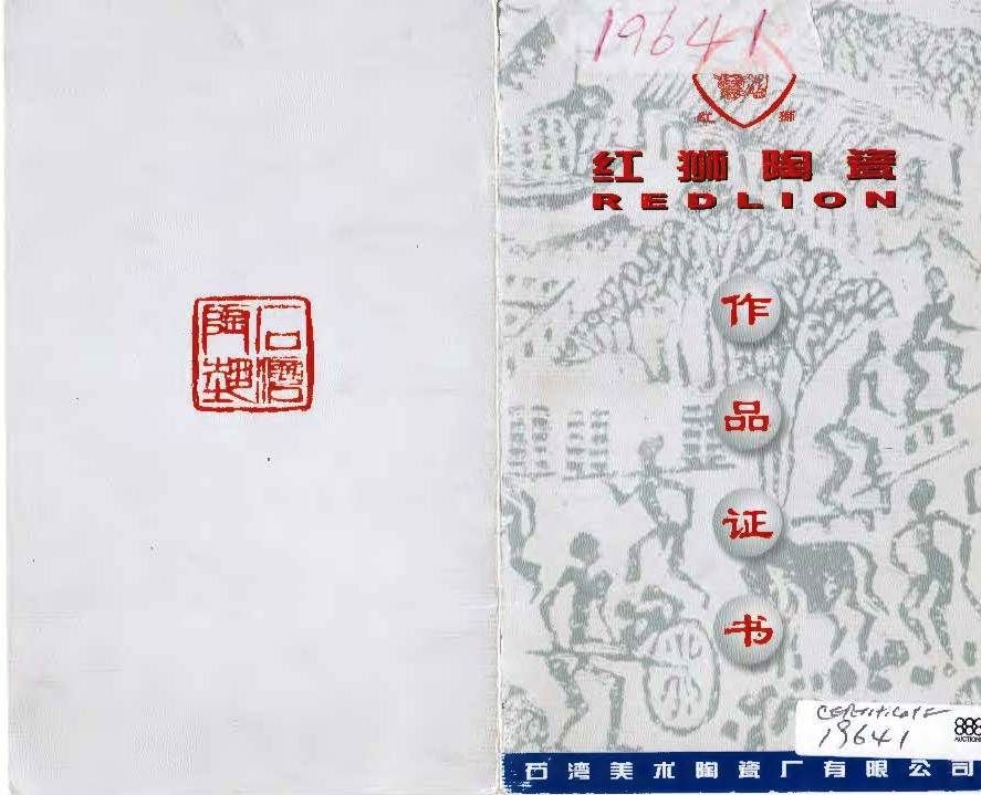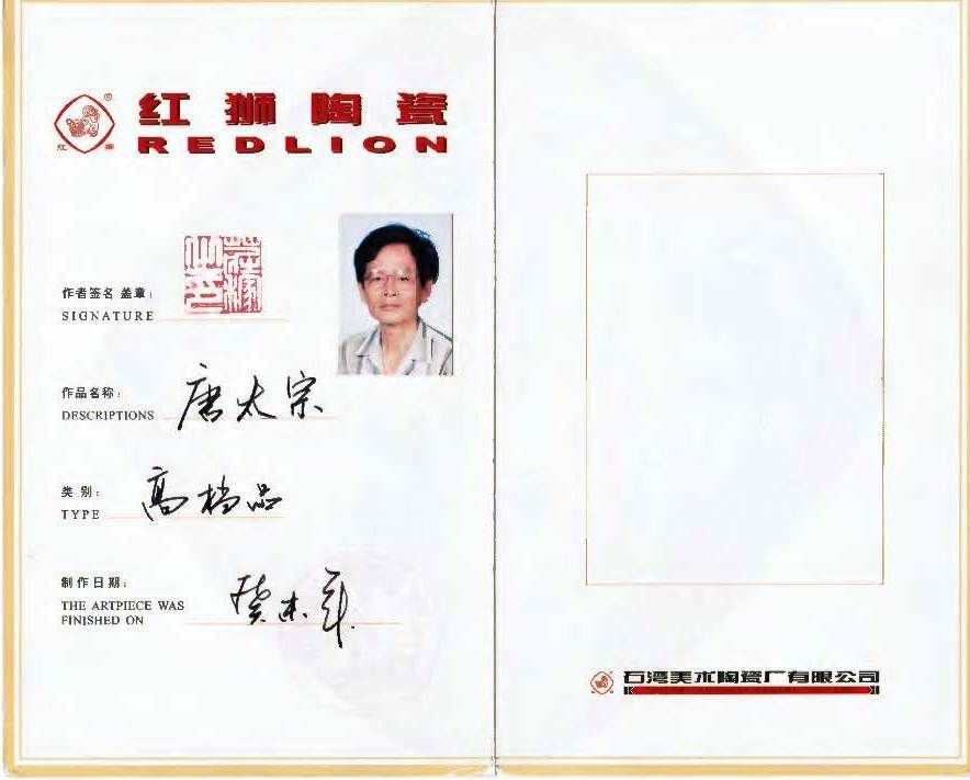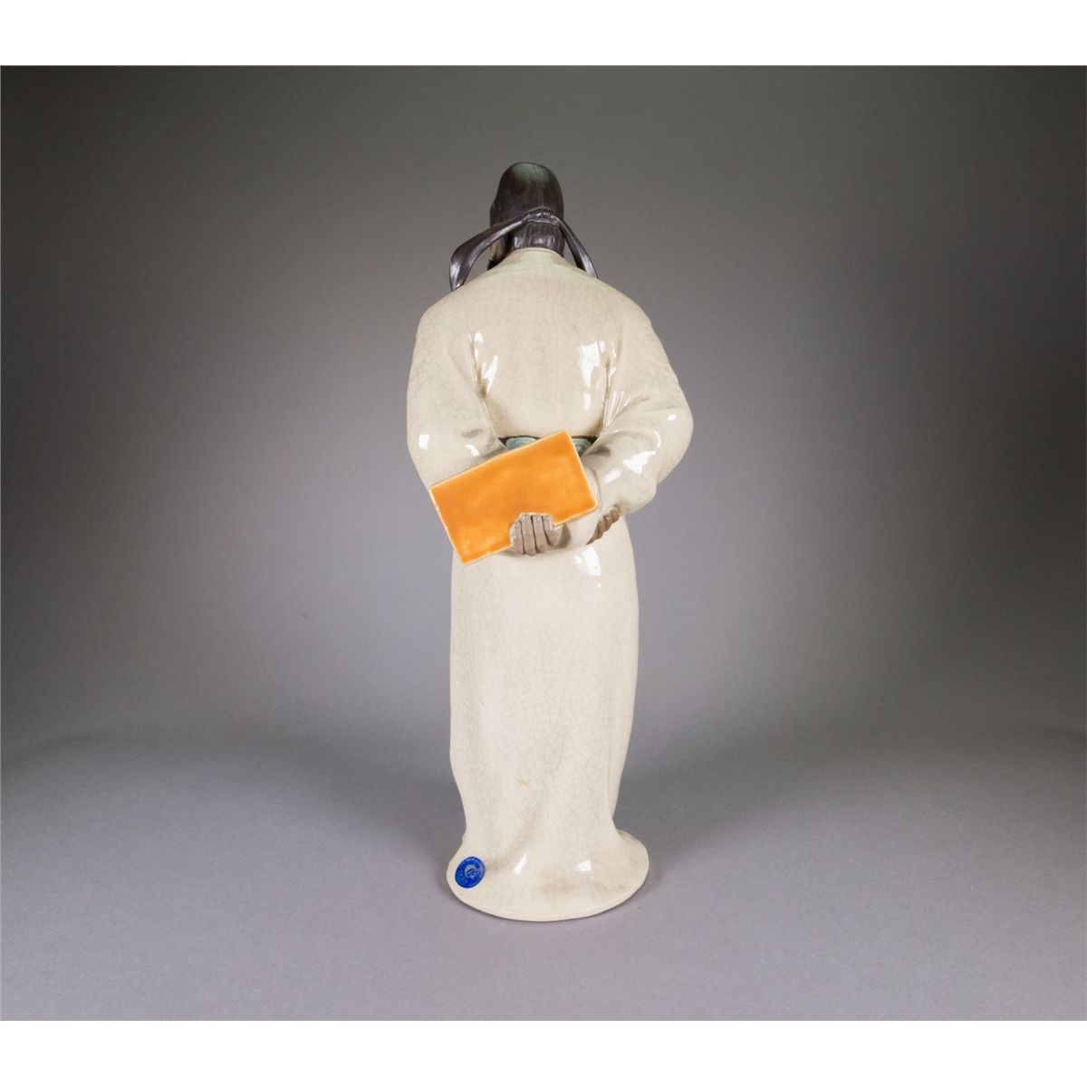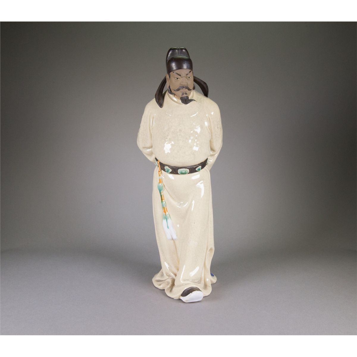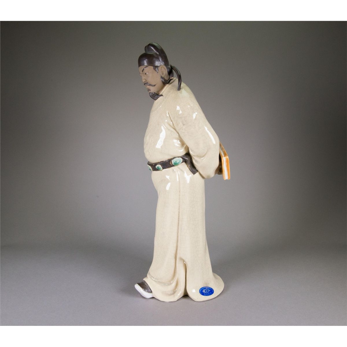 Chinese pottery figure; featuring Emperor Taizong of Tang standing with a book in his hands; blue sticker with number and artist seal on bottom; REDLION artist certificate with artist Zhuang Jia(1931-2006) seal included; H: 44 cm, W: 18 cm, 3471 grams