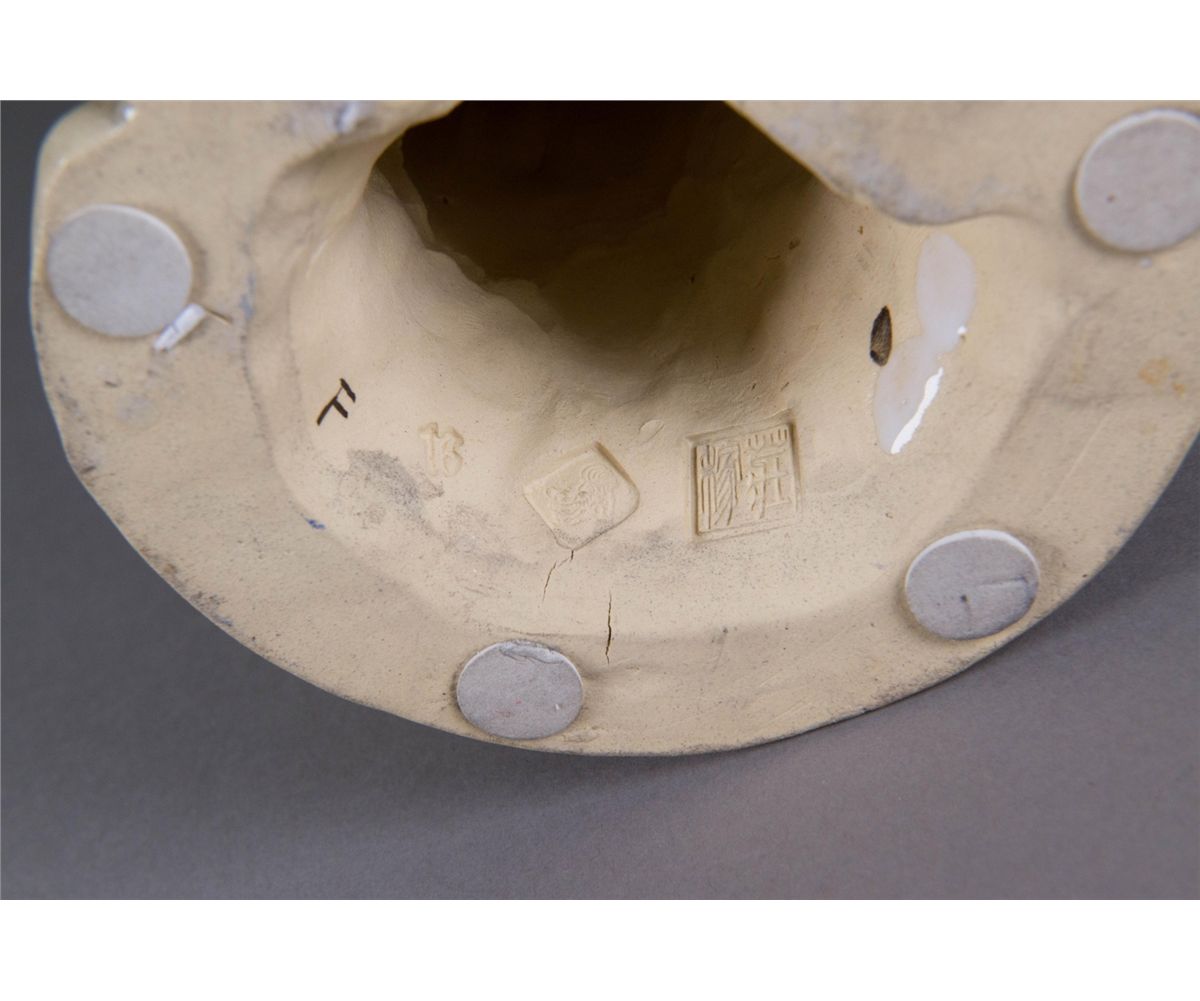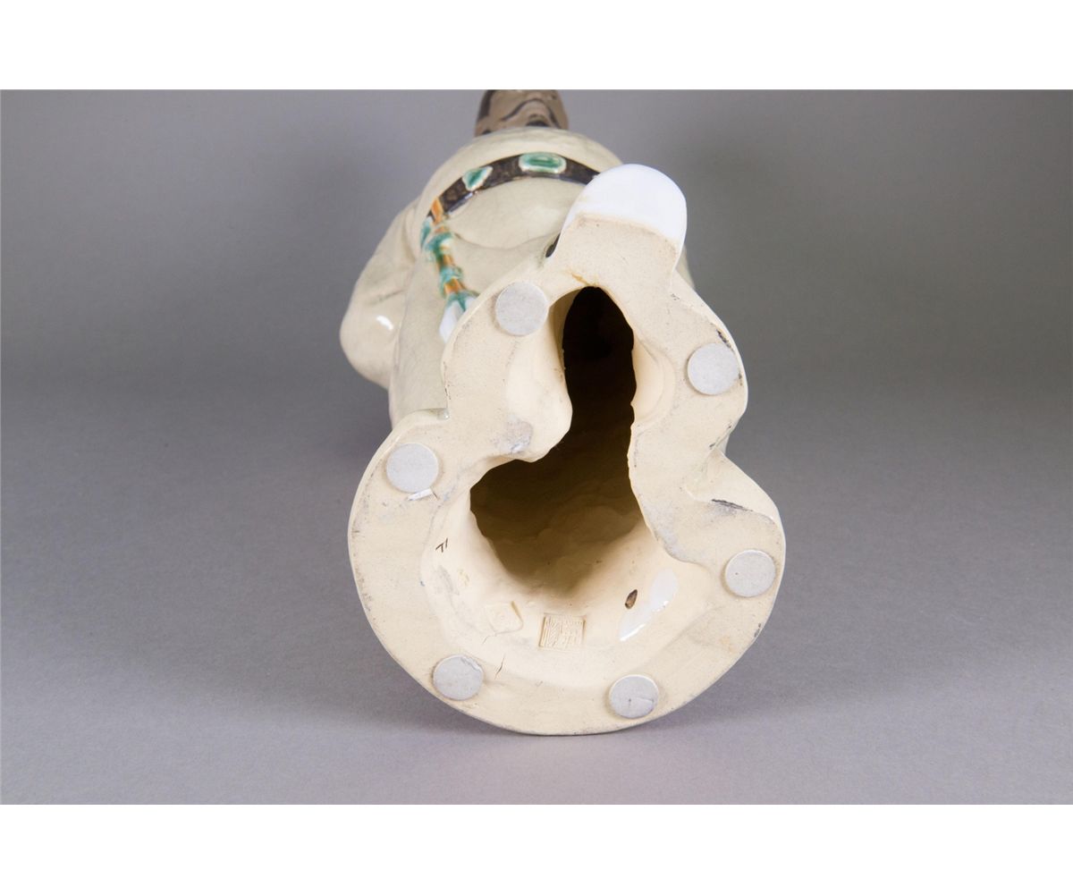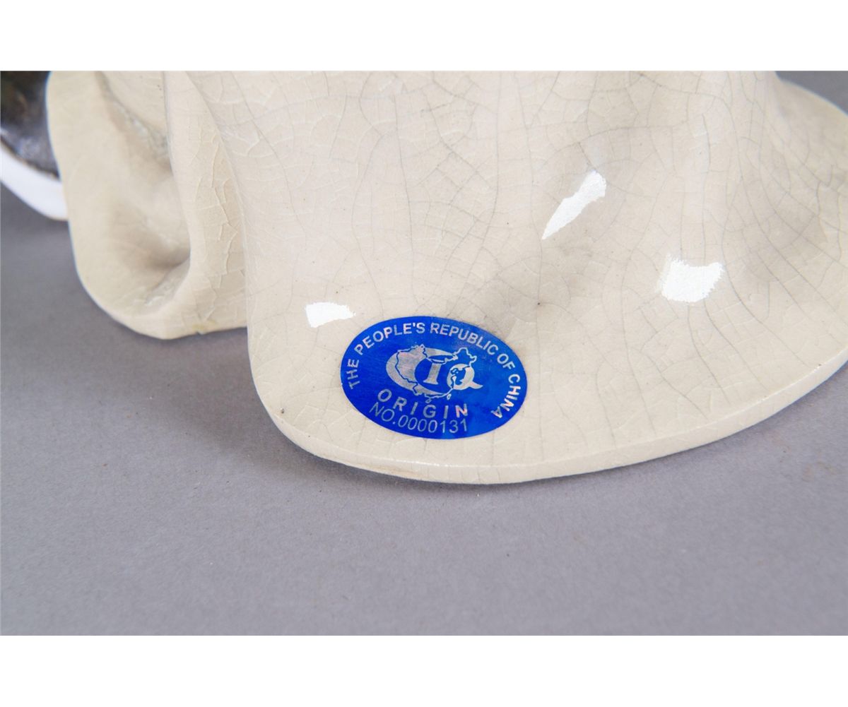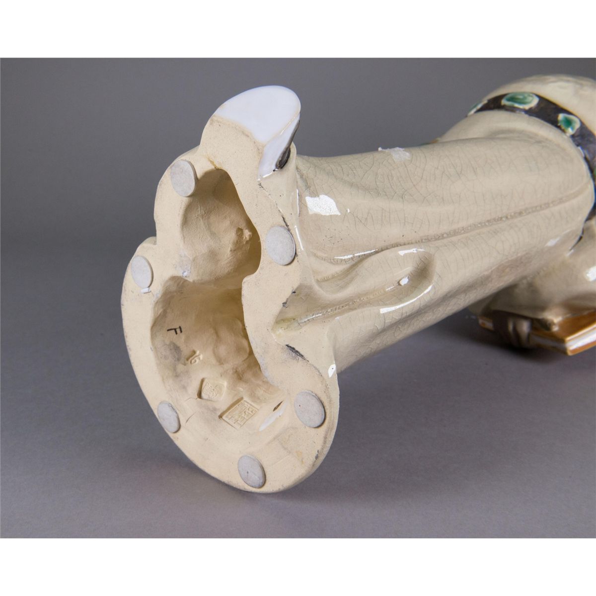 Chinese pottery figure; featuring Emperor Taizong of Tang standing with a book in his hands; blue sticker with number and artist seal on bottom; REDLION artist certificate with artist Zhuang Jia(1931-2006) seal included; H: 44 cm, W: 18 cm, 3471 grams