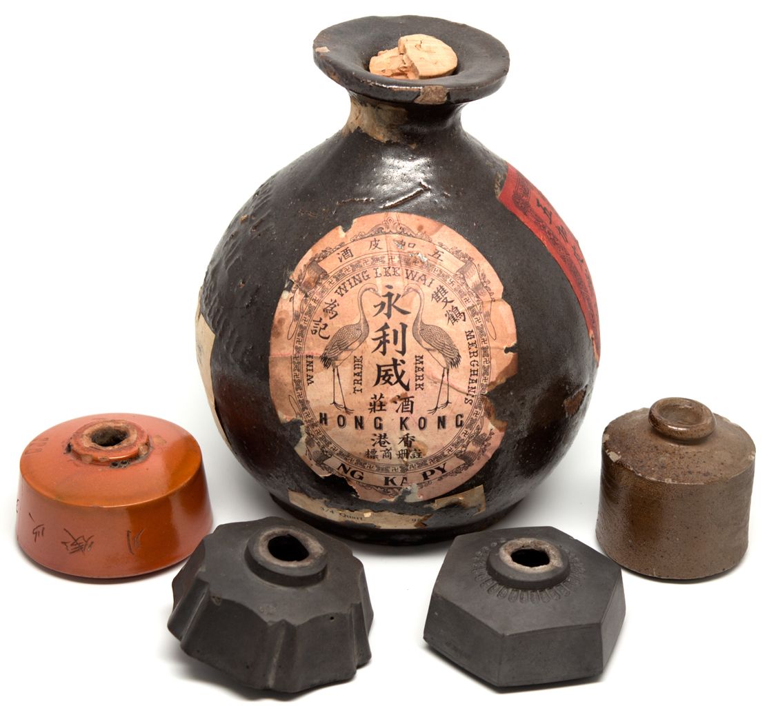 Lot of 5: 6" tall whiskey bottle imported from Hong Kong by Gum Loon Company of San Francisco. Also four ink well or opium bottles. - Jacobitz Collection -59631
