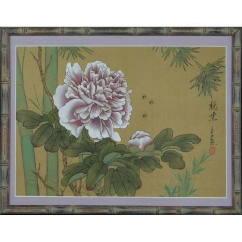 This is a beautiful original woodblock print. The smooth flowing, elegant petals are set in an asymmetrical composition that give them prominence in the picture. The exceptional use of cool greens on a dark ochre background also help to set the light purple flowers apart. This stunning composition is matted in a complimentary lavender colored mat that accents the flowers even further and framed in a bamboo style wood frame that adds to the oriental feel of the picture. An excellent combination of colors line and brushwork in an exceptional frame for a great price.