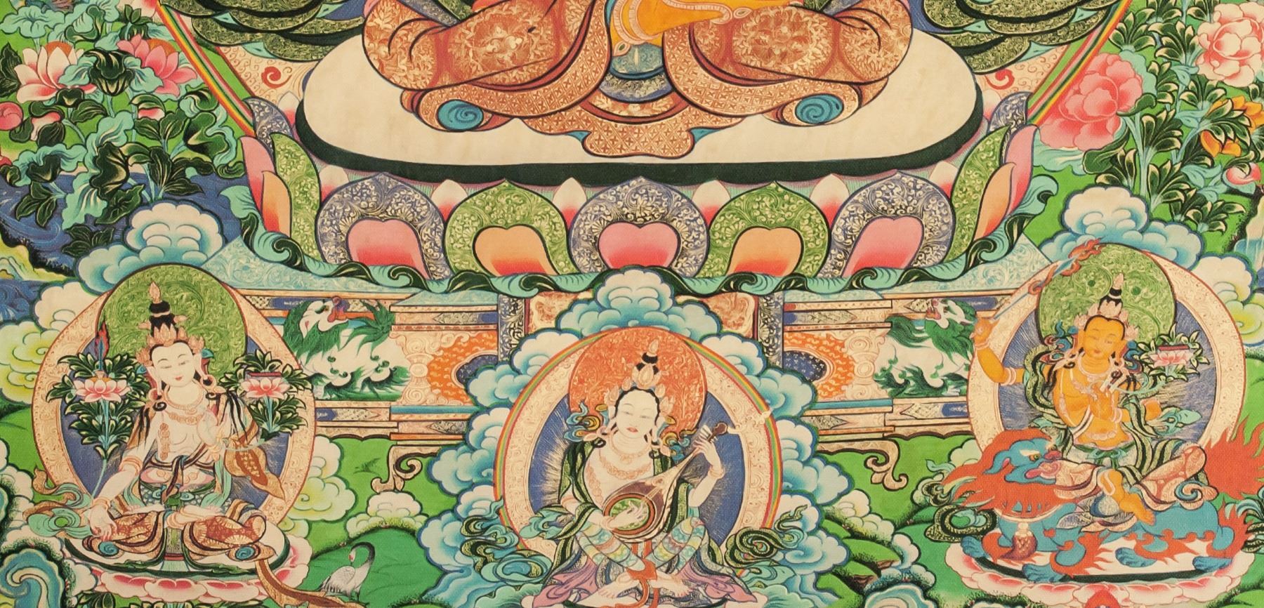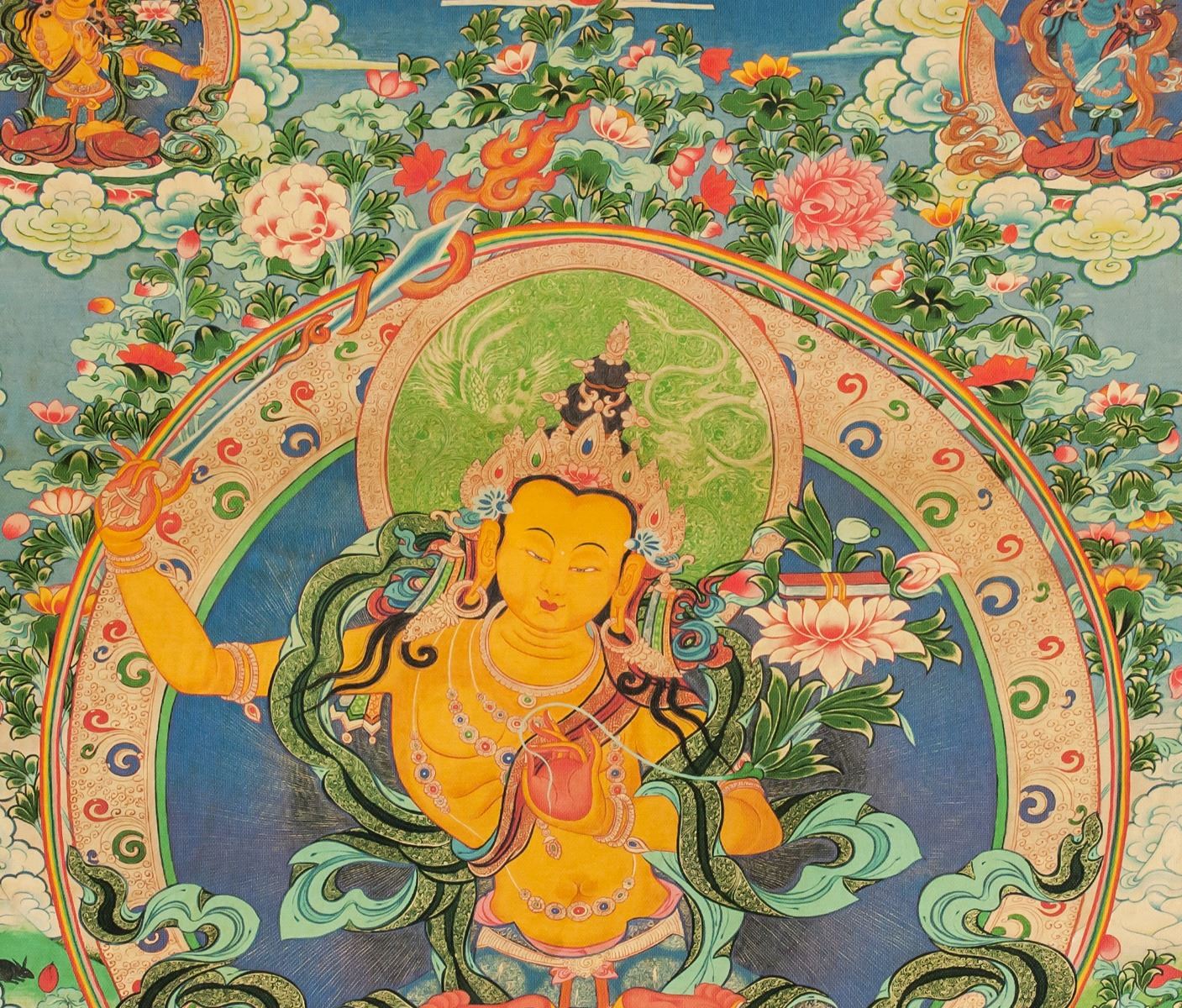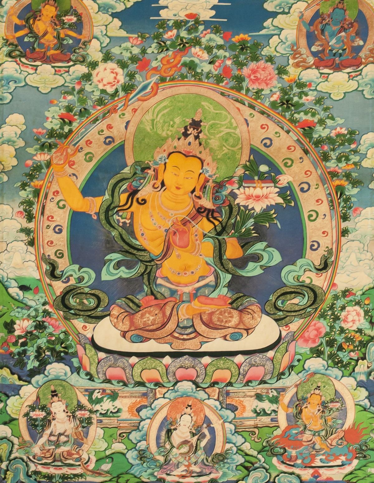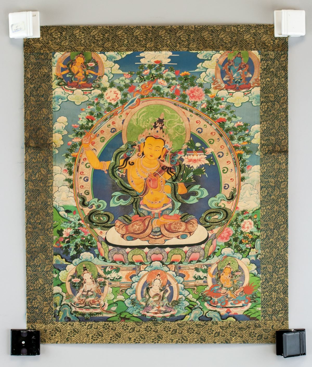 Chinese print on fabric. Featuring Manjushri Bodhisattva. 38 x 29 cm