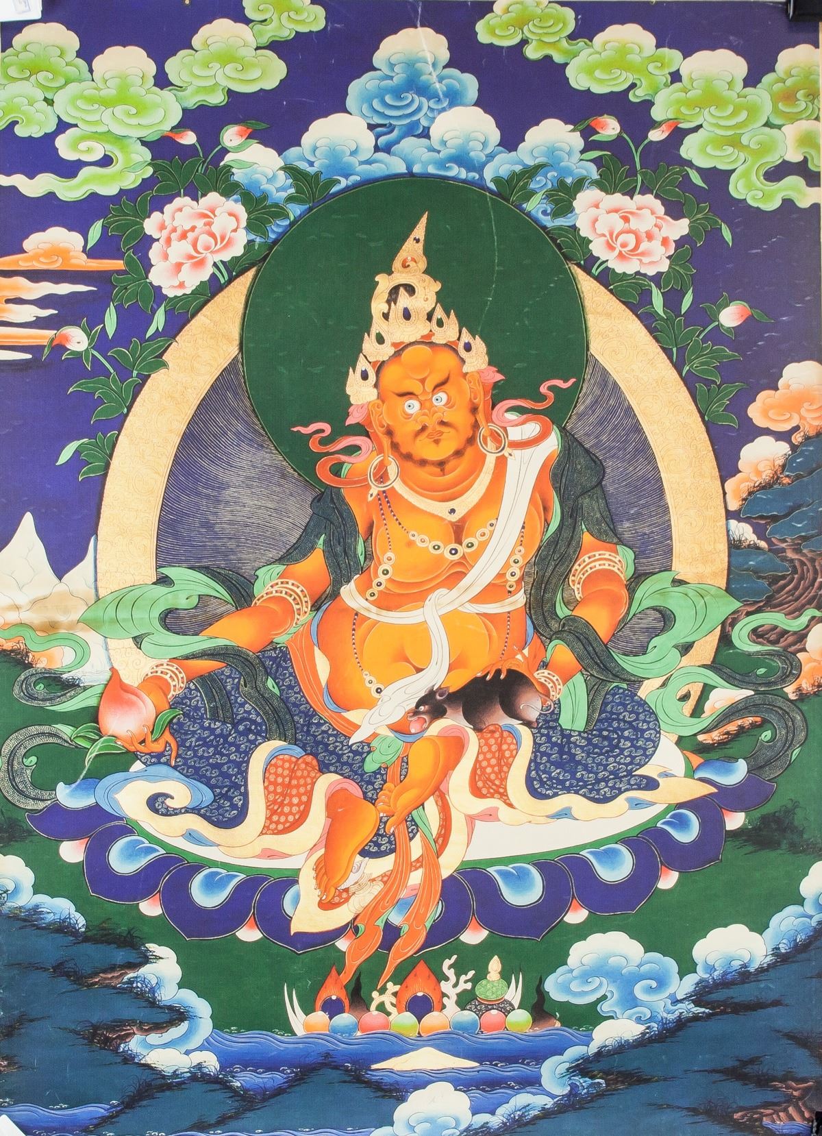 Chinese print tangka roll, featuring Yellow Jambhala, the treasure god, 90 x 65 cm