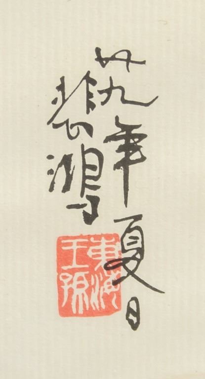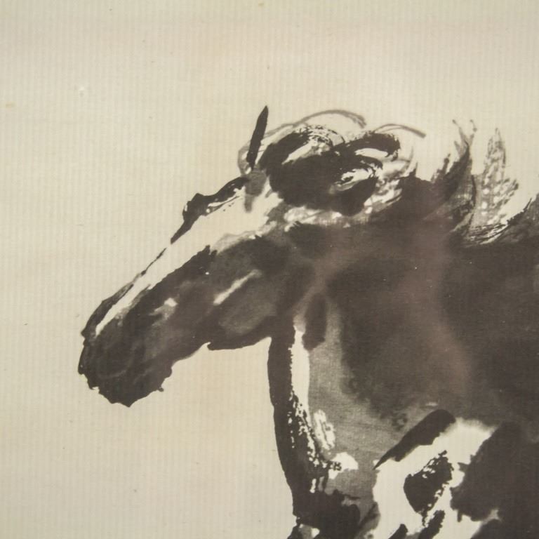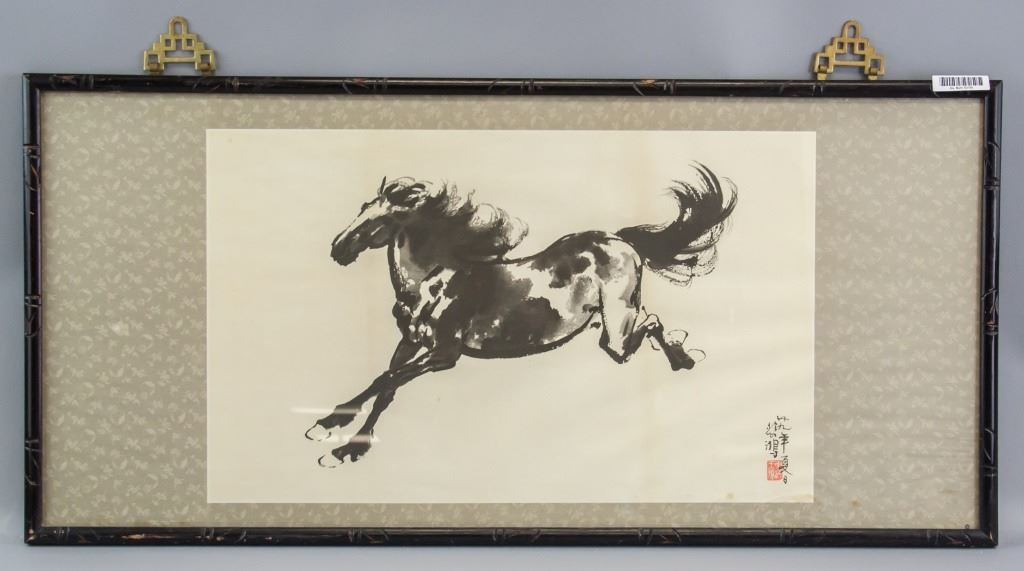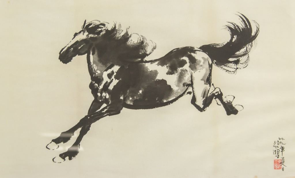 Chinese print on paper, framed. Featuring galloping horse. Signed "Beihong" to the bottom right in Chinese characters Inscribed with one seal. 34 x 75 cm (including frame).