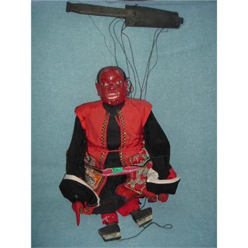 Unique old pre-World War 2 devil puppet in ceremonial dress, which is in excellent condition. Complete with strings & puppeteer's control paddle. Overall height 25". This is an unusually fine relic from the days of the old itinerant shinese story-tellers' art. Some strings snarled.
