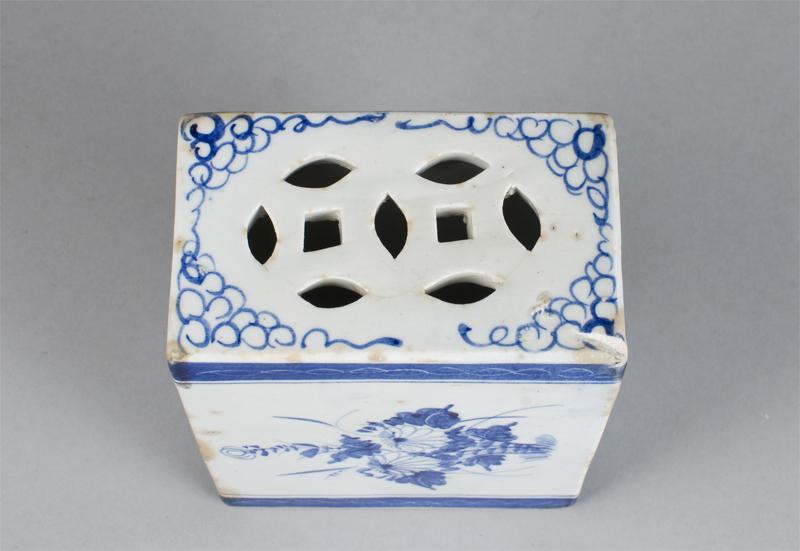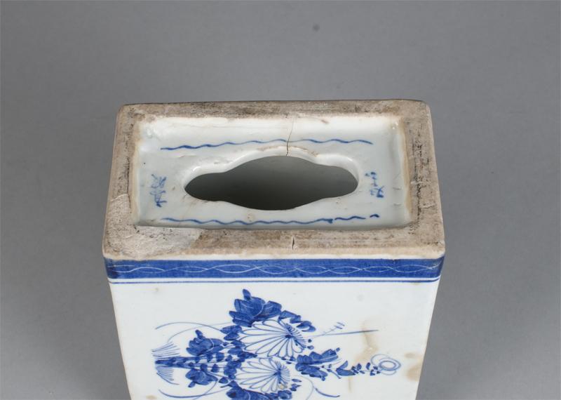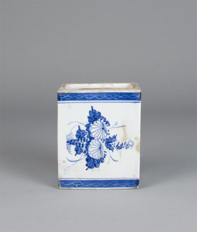 Depicting flowers on both sides with 2 bands of blue on top and bottom. 5.75" H, appears to bear Jiaqing 1796-1820 mark, staining of porcelain throughout, chip back left corner, chip on bottom of foot, otherwise a nice early piece of blue and white porcelain.