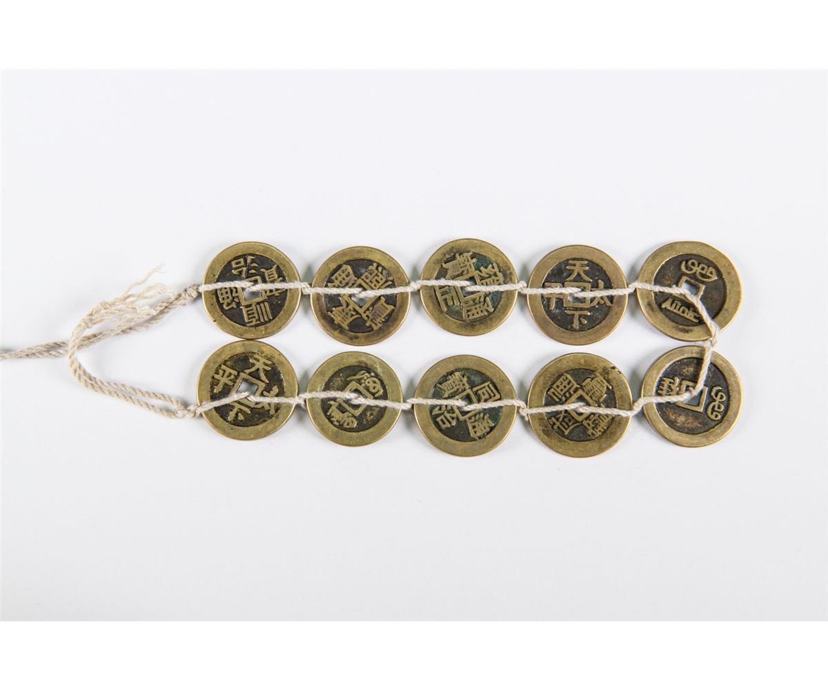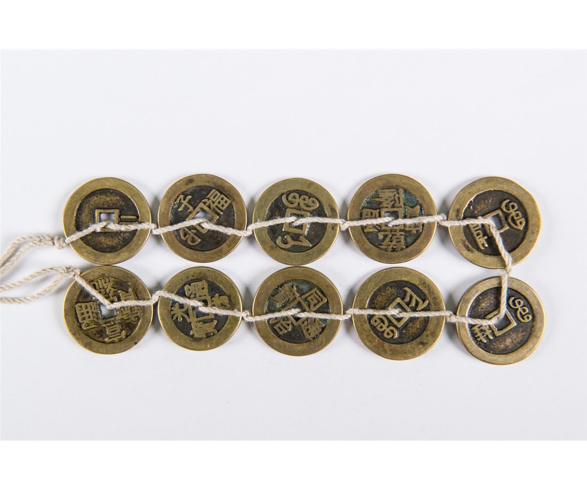 Chinese Qing bronze coins; featuring ten bronze coins with different periods' Tong Bao marks; D: 28 mm, Thickness: 1.5 mm, 86 grams total