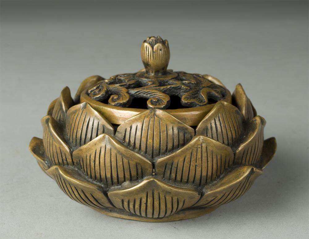 Finely molded in the form of a lotus with cut-out floral and stem lid. Six character mark for Great Da Qing Qianlong production on bottom. 2.75" H x 4.25" W. 20th Century.