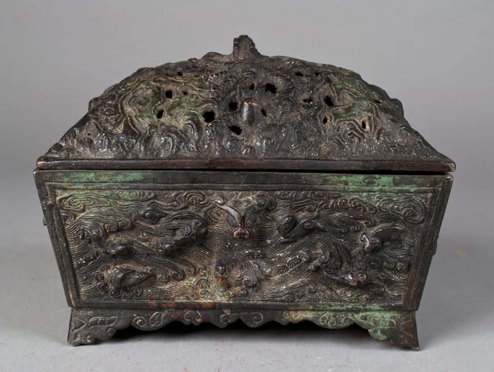 Depicting sea animals, the top lid depicting dragon. 7.5" L x 5 & 3/8" W x 5.75" H, circa 19th century.