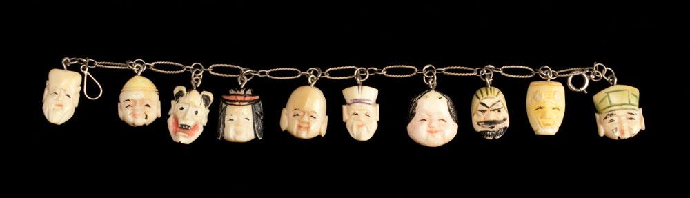 The bracelet finely carved and painted to depict ten various heads, hung from silver bracelet. 6.75" L. Circa 19th/Early 20th Century. Private collection Dearborn, Michigan.