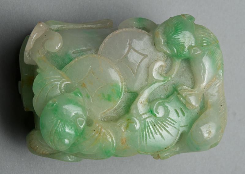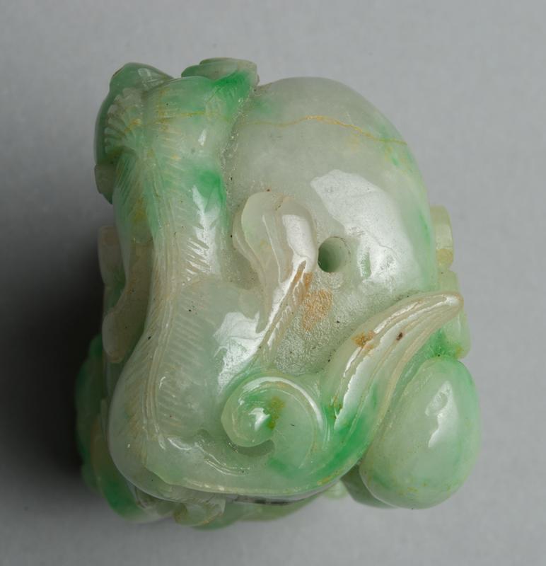 A large oblong pendant deeply carved on all sides in high relief to depict dragons, coins, fungus of immortality, gourds and bats, with fine detail and polish, 2"L x 1.375"W x 1.125"Thick, very well done, circa 19th century.