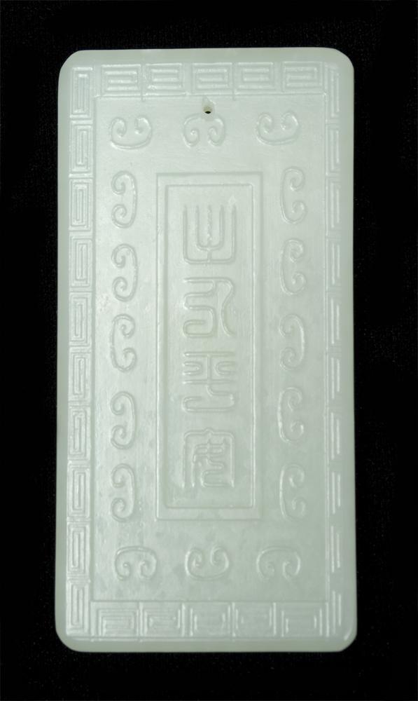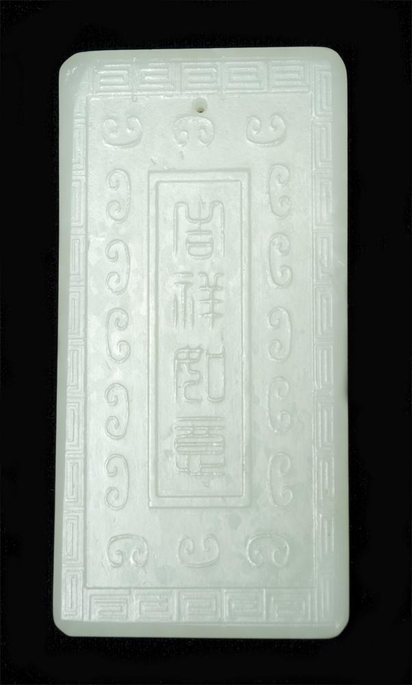 Finely carved to depict four character marks on each side with scrolling and Greek key designs, 3" H x 1.5" W. Late 19th/Early 20th Century.