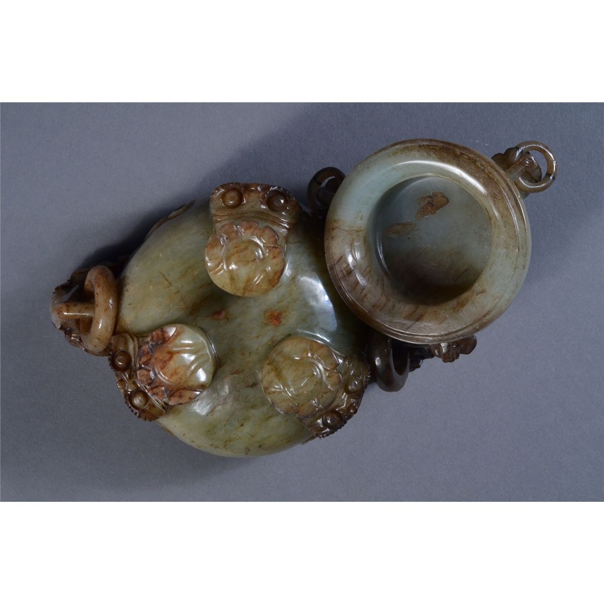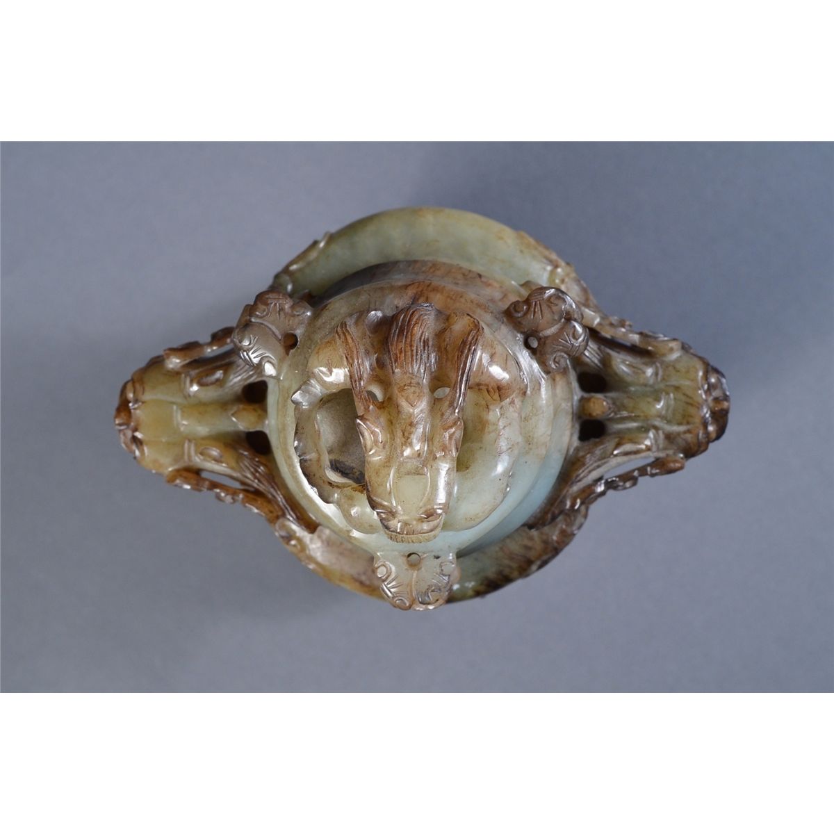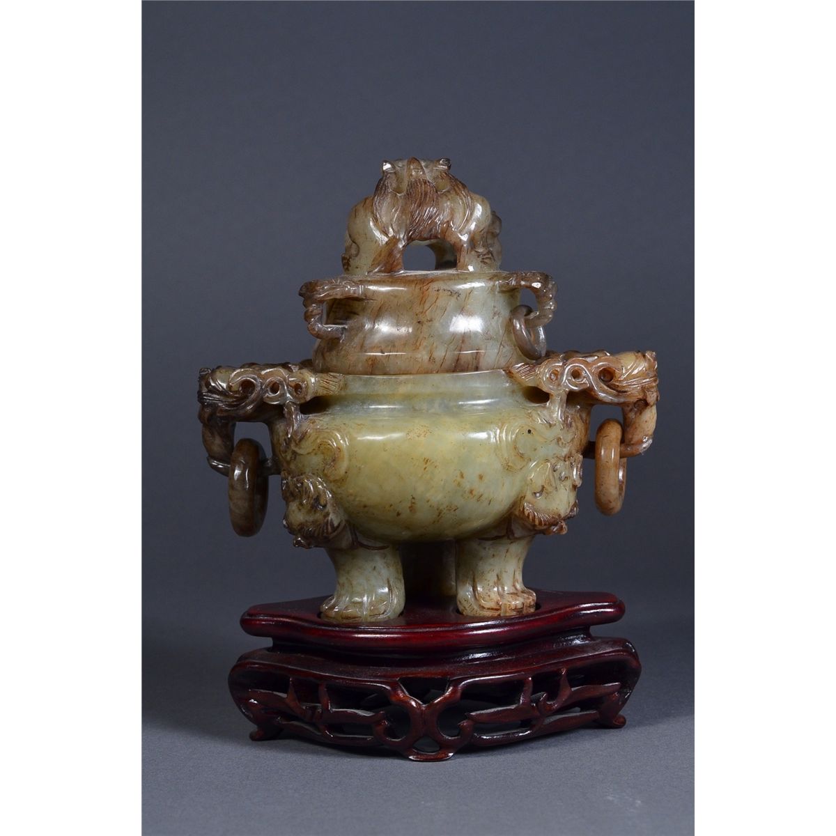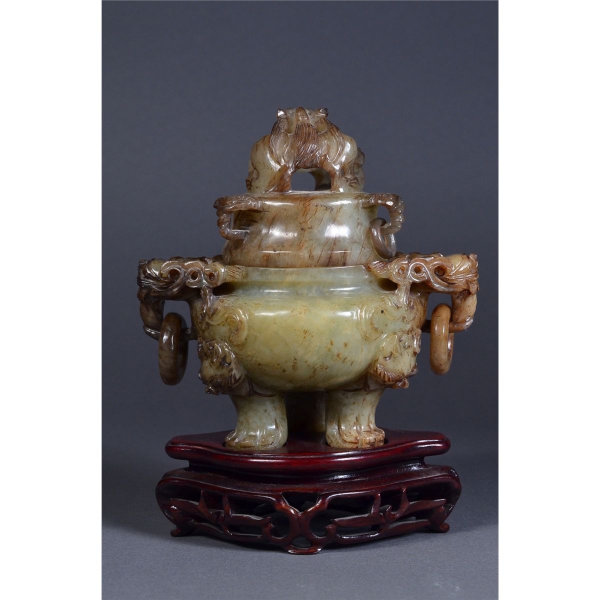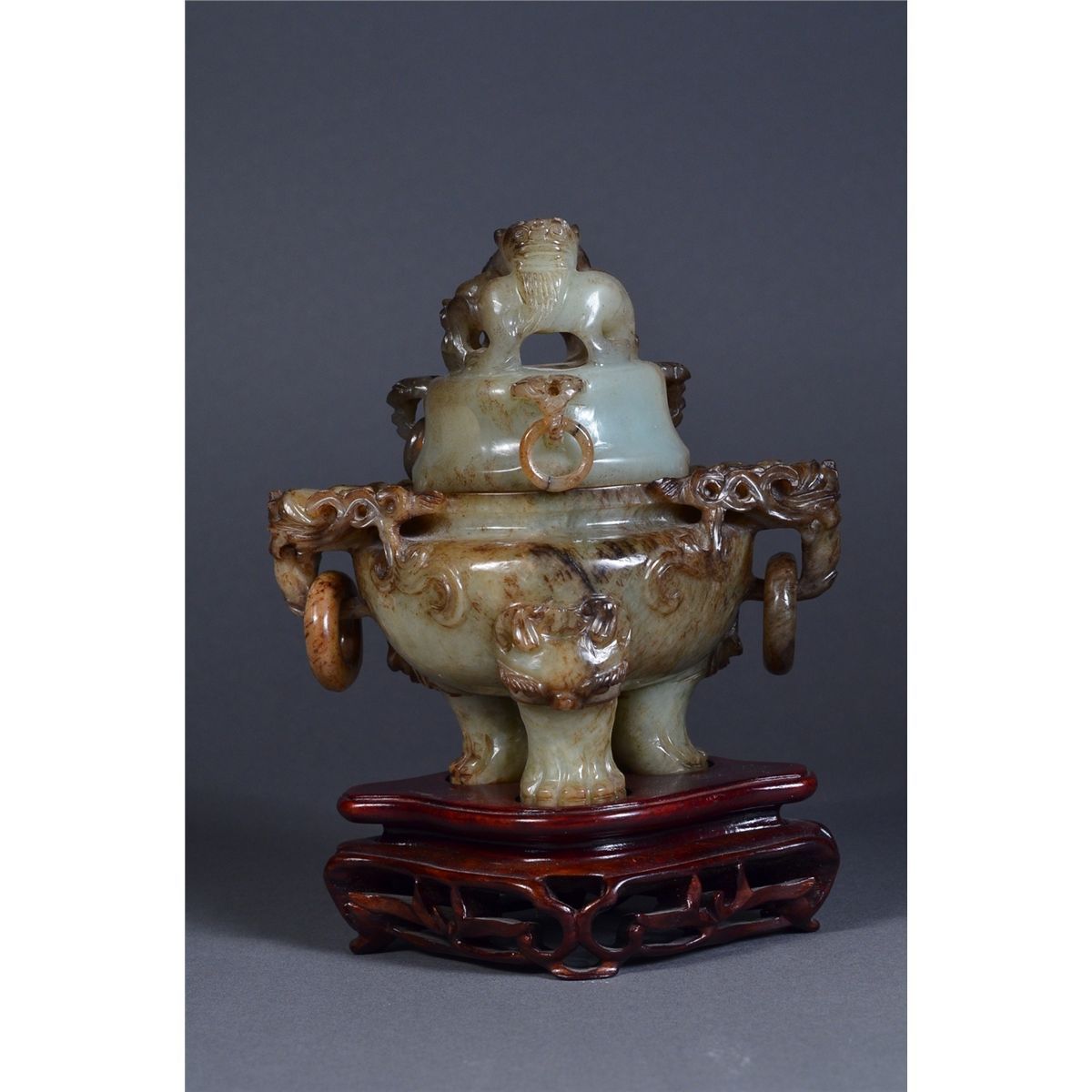 Chinese Qing Period celadon jade tripod censer and cover; squat ovoid body raised on three cabriole legs detailed with xenomorphic beast faces, with a pair of openwork carved large mythical beast handles, each projecting from the shoulder and suspending loose rings; domed cover with three projecting handles in dual ruyi-head form and suspending loose rings, surmounted by a carved openwork beast in contorted position: its beard and mane with finely incised hair and facial features; the stone of dark celadon colouration with dark suffusions and rivering (missing one suspended loose dome ring); the stone of translucent dark celadon tone; L: 13 cm, H: 13 cm, D: 8 cm, 593 grams, openwork wood stand
