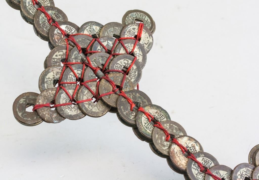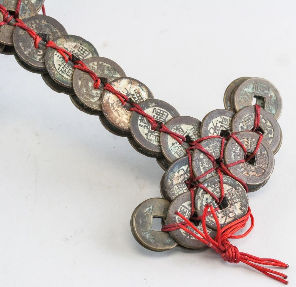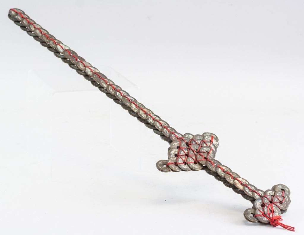Chinese coin collection. Qing coins bound with red string into the form of a sword. 50 x 11 cm, 479 grams.