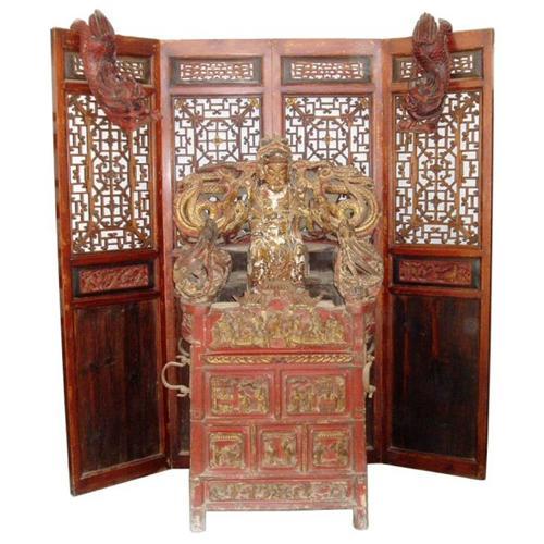 The antique furniture is a set of exquisite chinese Qing dynasty's deity shrine made of wood gathered from Hebei province in China.A wonderful piece for a room that can hold it.At the beginning of the Qing Dynasty, furniture followed Ming patterns and styles.Qing Furniture showed its own uniqueness with the absorption of western art. It was larger in size with grandeur and pageantry.Engraving was a popular and important means of furniture decoration. The subjects range from auspicious character patterns, to geometric patterns and scenes in nature with animals, mountains and waters, flowers and grass. Color painting, especially gold painting, was widely used.Commercial symbols emerged, such as patterns concerning money and fortune.To later Qing furniture has less engraving ,instead ,inlays of stone, which catch the eye more easily than exquisite engraving, are used to tell of the luxurious lifestyle of the owner. In addition, color and gold painting become the vogue depicting the preference for gaudiness by the wealthy.