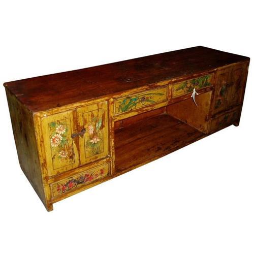 The antique furniture is a piece of exquisite chinese Qing dynasty's painting sideboard made of wood gathered from Hebei province in China.A wonderful piece for a room that can hold it.At the beginning of the Qing Dynasty, furniture followed Ming patterns and styles.Qing Furniture showed its own uniqueness with the absorption of western art. It was larger in size with grandeur and pageantry.Engraving was a popular and important means of furniture decoration. The subjects range from auspicious character patterns, to geometric patterns and scenes in nature with animals, mountains and waters, flowers and grass. Color painting, especially gold painting, was widely used.Commercial symbols emerged, such as patterns concerning money and fortune.To later Qing furniture has less engraving ,instead ,inlays of stone, porcelain and bone, which catch the eye more easily than exquisite engraving, are used to tell of the luxurious lifestyle of the owner. In addition, color and gold painting become the vogue depicting the preference for gaudiness by the wealthy.
