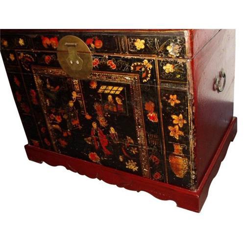 The antique furniture is a piece of exquisite chinese Qing dynasty's painting trunk made of wood gathered from Shanxi province in China.A wonderful piece for a room that can hold it.At the beginning of the Qing Dynasty, furniture followed Ming patterns and styles.Qing Furniture showed its own uniqueness with the absorption of western art. It was larger in size with grandeur and pageantry.Engraving was a popular and important means of furniture decoration. The subjects range from auspicious character patterns, to geometric patterns and scenes in nature with animals, mountains and waters, flowers and grass. Color painting, especially gold painting, was widely used.Commercial symbols emerged, such as patterns concerning money and fortune.To later Qing furniture has less engraving ,instead ,inlays of stone, porcelain and bone, which catch the eye more easily than exquisite engraving, are used to tell of the luxurious lifestyle of the owner. In addition, color and gold painting become the vogue depicting the preference for gaudiness by the wealthy.