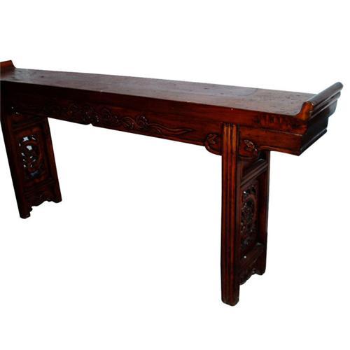 The antique furniture is a piece of exquisite chinese Qing dynasty's console table with spandrels made of wood gathered from Shanxi province in China.A wonderful piece for a room that can hold it.At the beginning of the Qing Dynasty, furniture followed Ming patterns and styles.Qing Furniture showed its own uniqueness with the absorption of western art. It was larger in size with grandeur and pageantry.Engraving was a popular and important means of furniture decoration. The subjects range from auspicious character patterns, to geometric patterns and scenes in nature with animals, mountains and waters, flowers and grass. Color painting, especially gold painting, was widely used.Commercial symbols emerged, such as patterns concerning money and fortune.To later Qing furniture has less engraving ,instead ,inlays of stone, porcelain and bone, which catch the eye more easily than exquisite engraving, are used to tell of the luxurious lifestyle of the owner. In addition, color and gold painting become the vogue depicting the preference for gaudiness by the wealthy.
