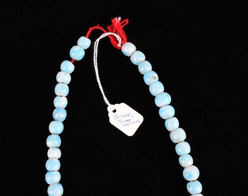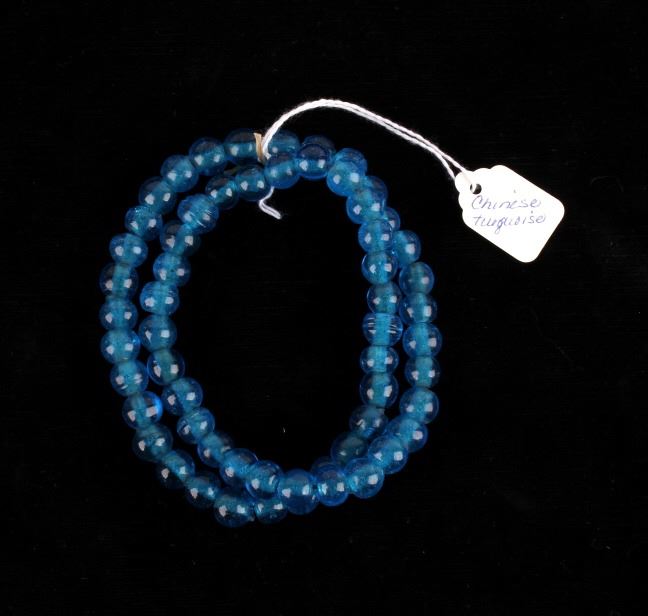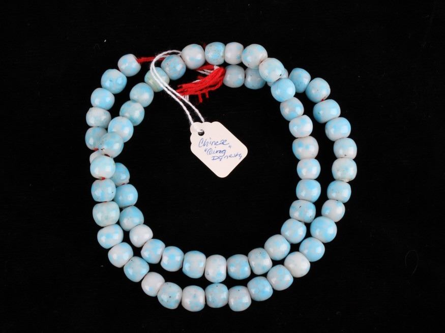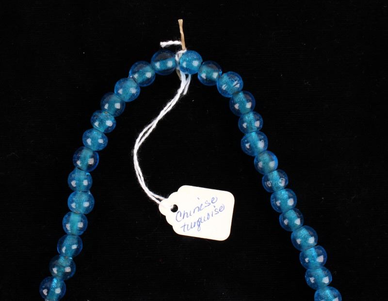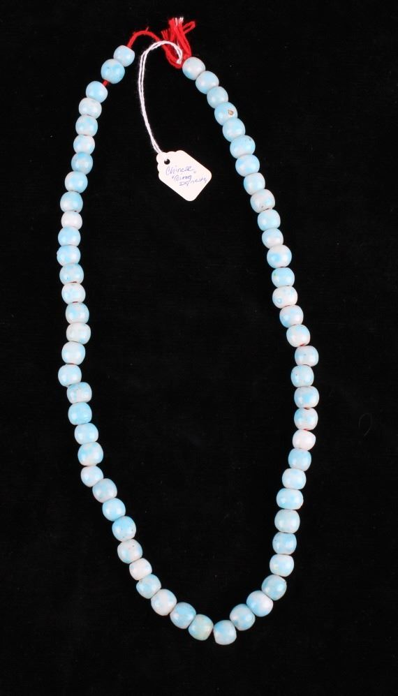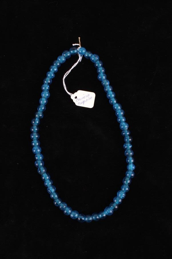 For your consideration in this lot is a set of Chinese Peking glass and turquoise bead necklaces. This lot includes a red Chinese Peking glass, a Chinese "Qing Dynasty" Peking glass, and a Chinese turquoise necklace. All three necklaces are in good condition with polished beads that show wear appropriate for age. The red Chinese Peking glass necklace is strung together with a black rubber cord. The Chinese "Qing Dynasty" piece has 63 beads strung together by a red cotton string and is marked with a "Chinese Qing Dynasty" tag. This item measures 13" strung and approximately 28 1/2" in circumference. The Chinese turquoise piece has 59 Peking glass beads strung together by a waxed cord and is marked with a "Chinese Turquoise" tag. This piece measures 9 1/2" strung and approximately 21" in circumference. The red Chinese Peking glass piece has 88 beads strung together by a black plastic-coated wire. This piece measures 11 1/2" strung and approximately 24 1/2" in circumference.