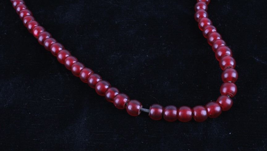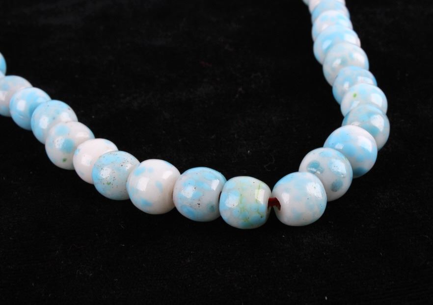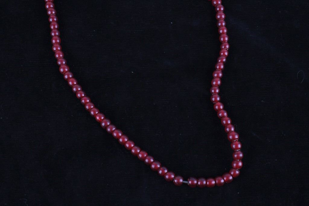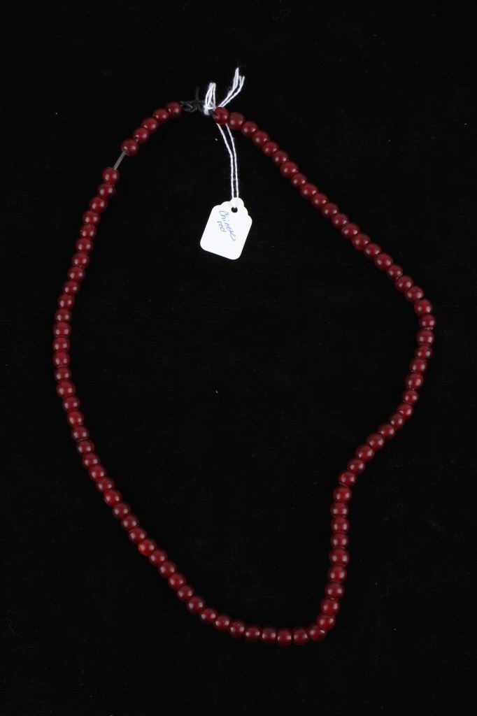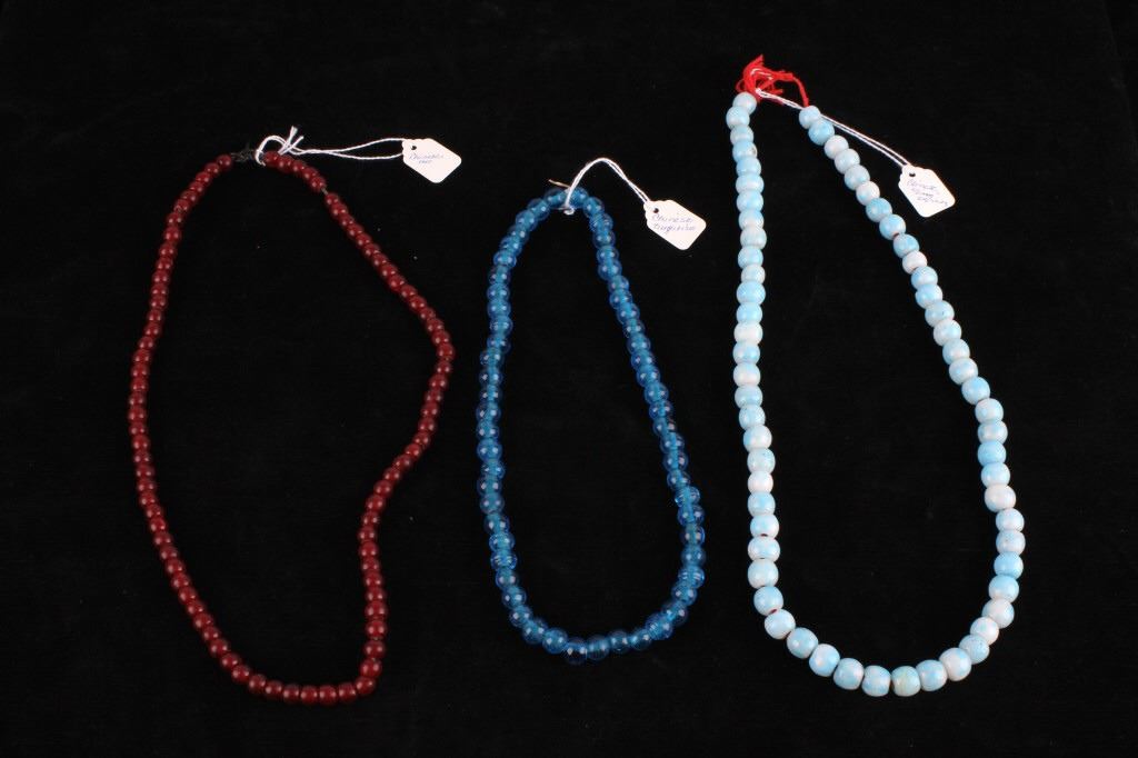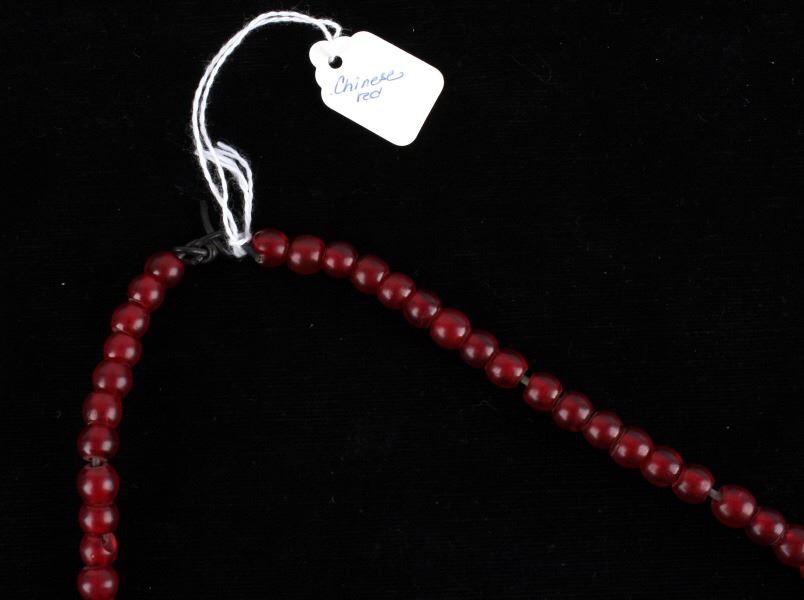 For your consideration in this lot is a set of Chinese Peking glass and turquoise bead necklaces. This lot includes a red Chinese Peking glass, a Chinese "Qing Dynasty" Peking glass, and a Chinese turquoise necklace. All three necklaces are in good condition with polished beads that show wear appropriate for age. The red Chinese Peking glass necklace is strung together with a black rubber cord. The Chinese "Qing Dynasty" piece has 63 beads strung together by a red cotton string and is marked with a "Chinese Qing Dynasty" tag. This item measures 13" strung and approximately 28 1/2" in circumference. The Chinese turquoise piece has 59 Peking glass beads strung together by a waxed cord and is marked with a "Chinese Turquoise" tag. This piece measures 9 1/2" strung and approximately 21" in circumference. The red Chinese Peking glass piece has 88 beads strung together by a black plastic-coated wire. This piece measures 11 1/2" strung and approximately 24 1/2" in circumference.