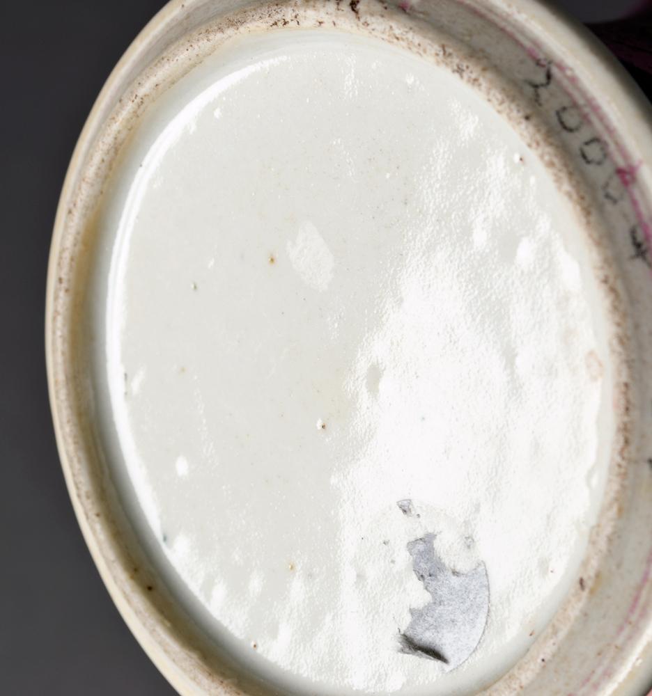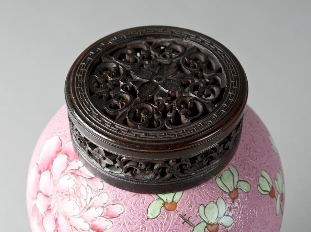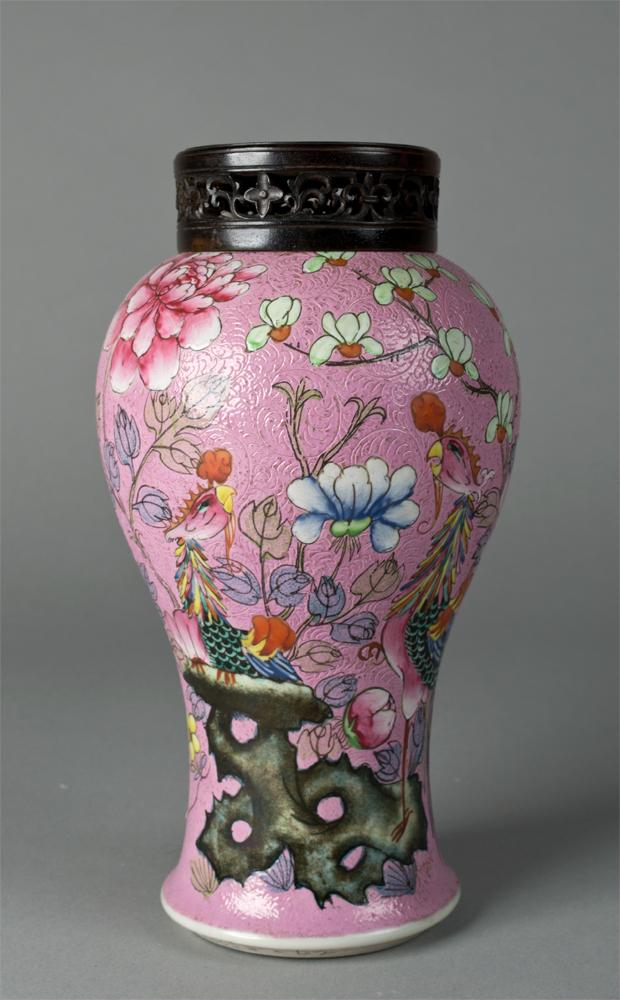 With a scraffiato pink and graviata ground. Painted to depict phoenix and flowers, 9.5"H 19th century.