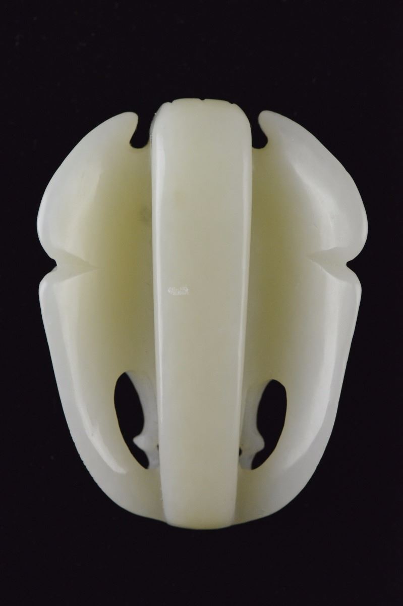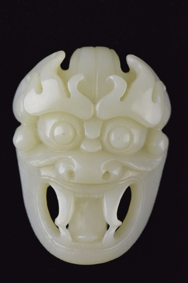 Chinese Qing Hetian White Jade Carved Mask. The stone of translucent white tone. Carving is fine and detailed. H 7 cm, W 5 cm, 83 grams