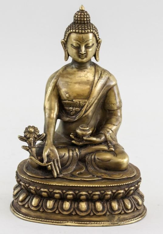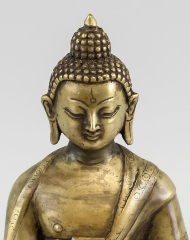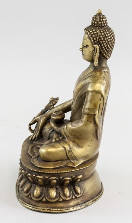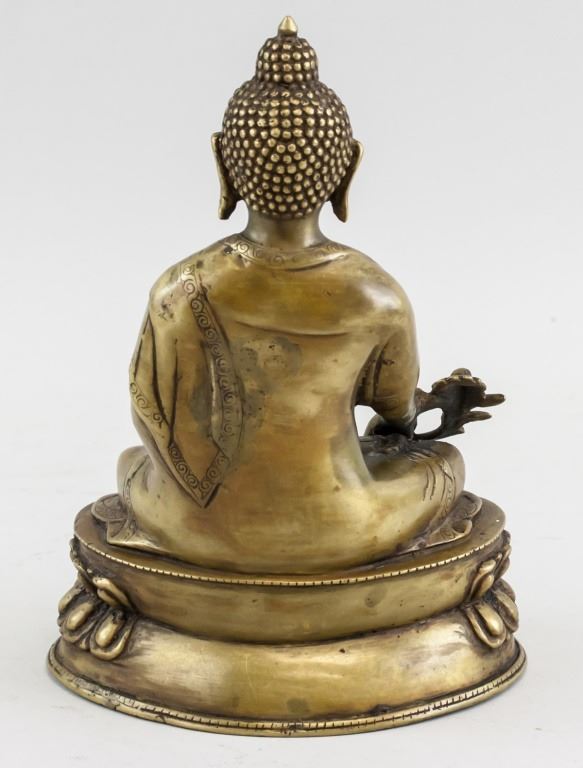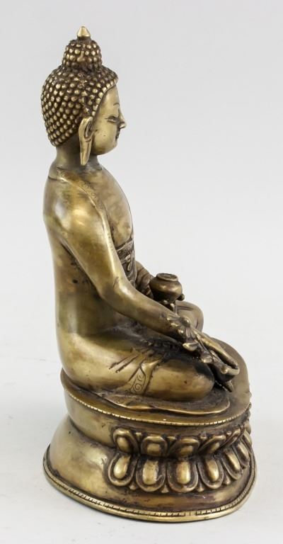 Chinese bronze statue. Featuring seated Buddha on lotus. Possibly Qing period. 13.5 x 15 cm, 1367 grams.