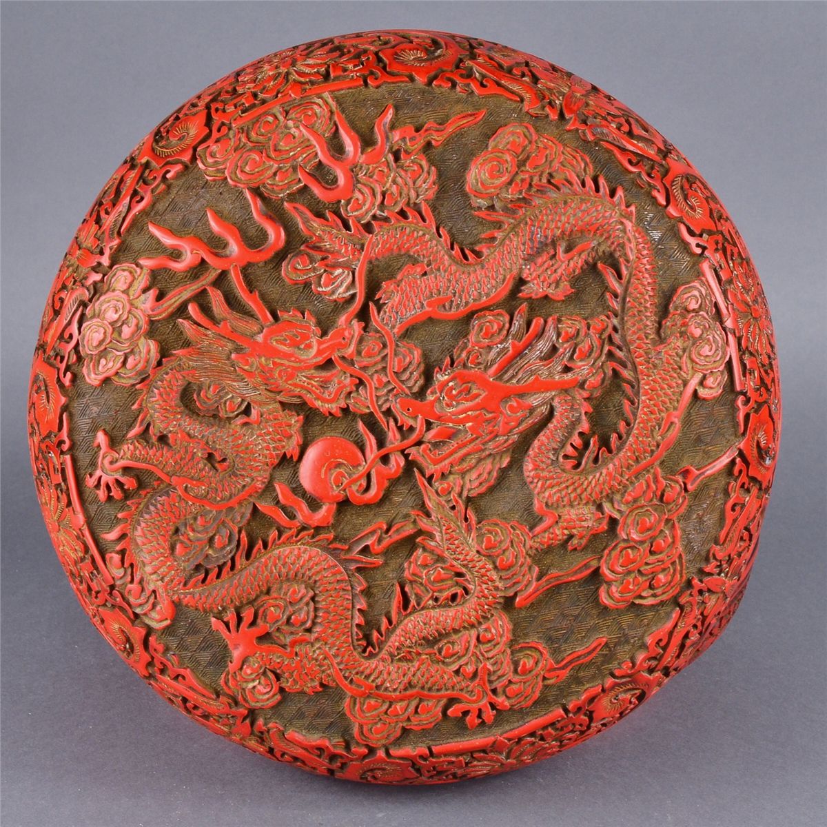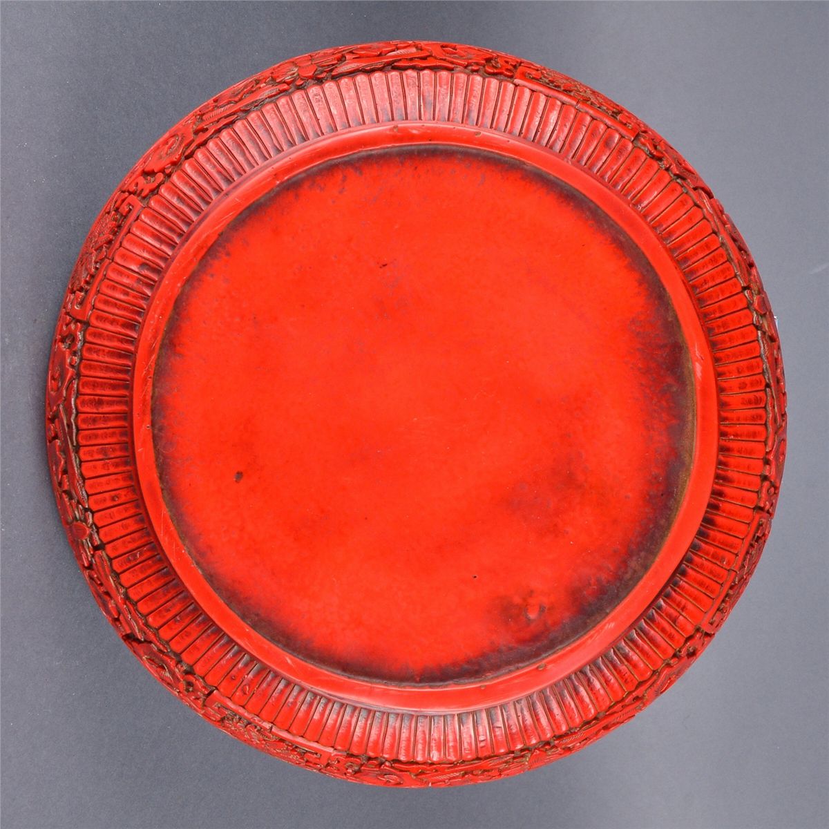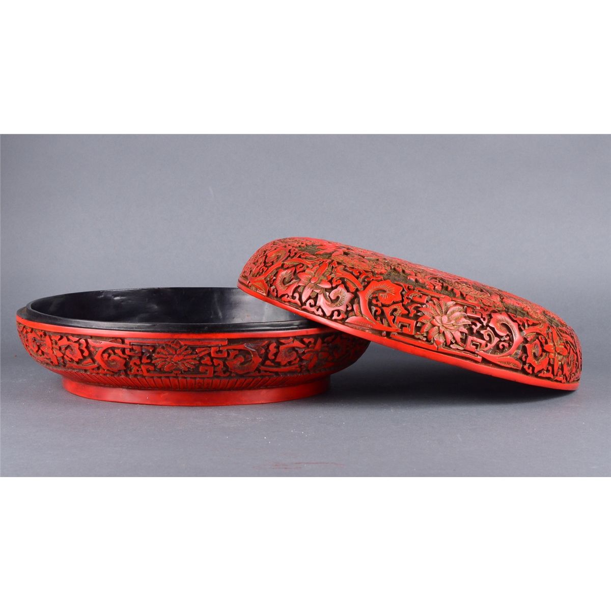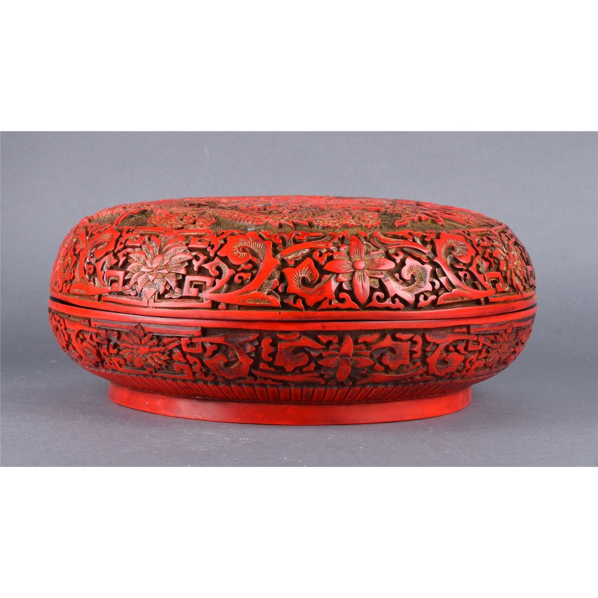 Chinese Qing Period carved cinnabar lacquer box; D: 32 cm, H: 12 cm