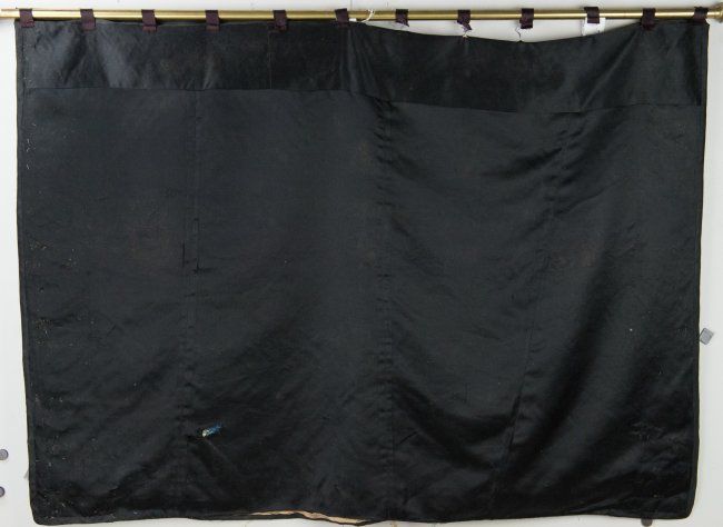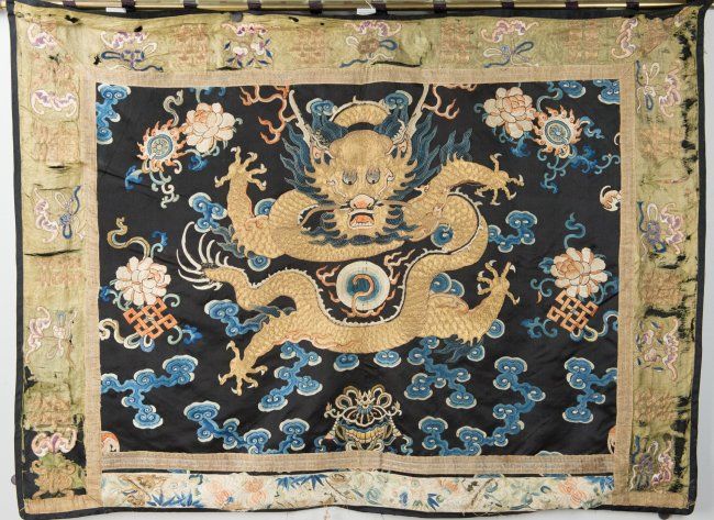 Chinese Qing Period silk embroidery; featuring dragon with flaming pearl amid stylized ruyi-head cloud scrolls; 120 cm x 84 cm
