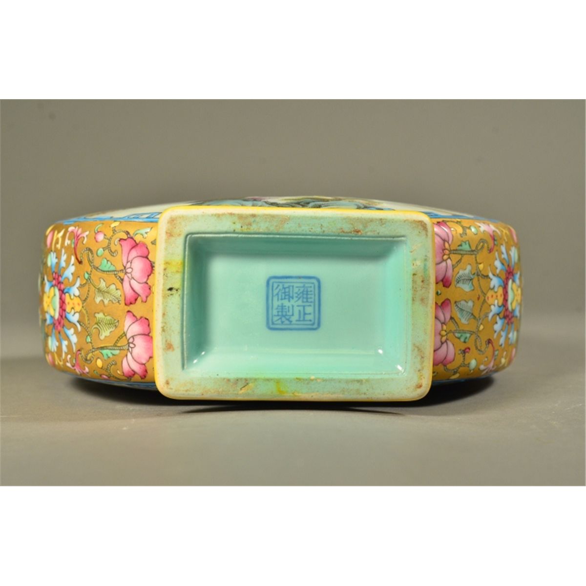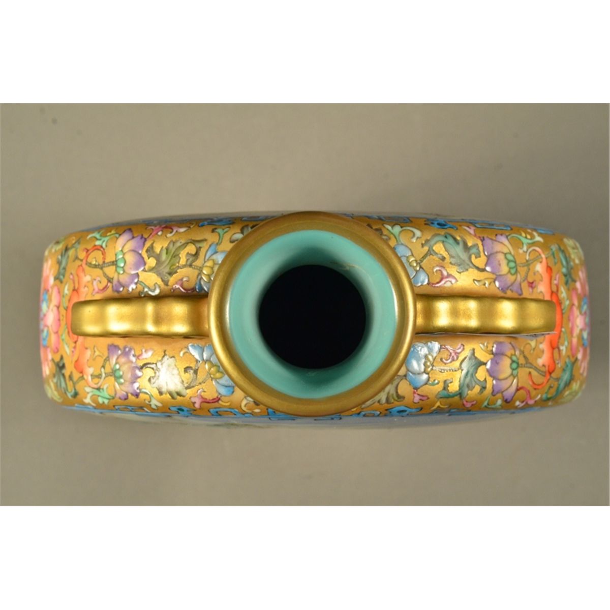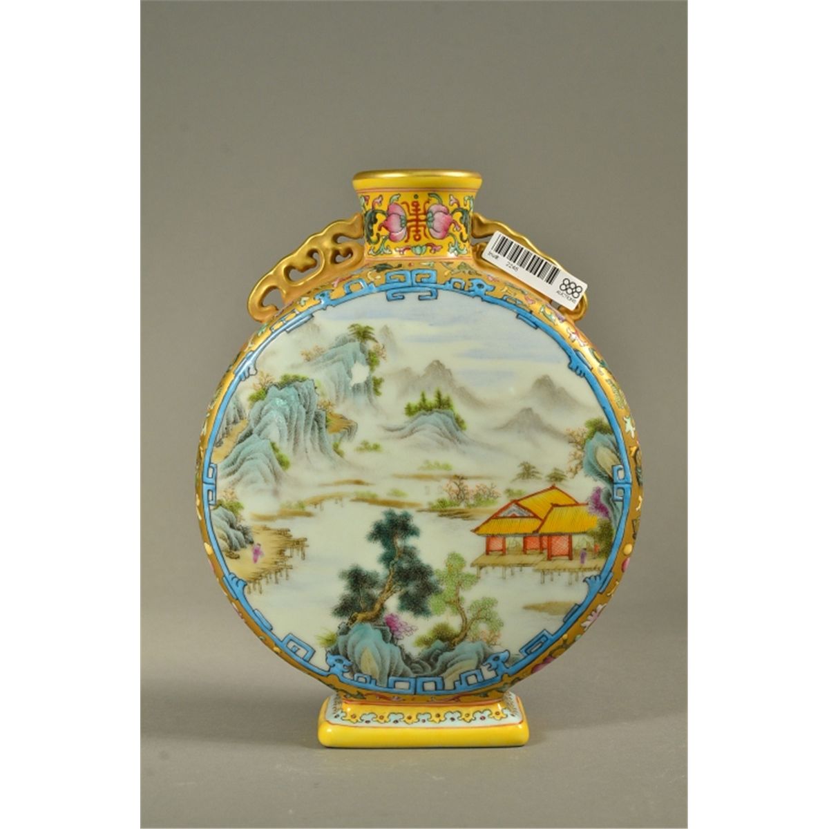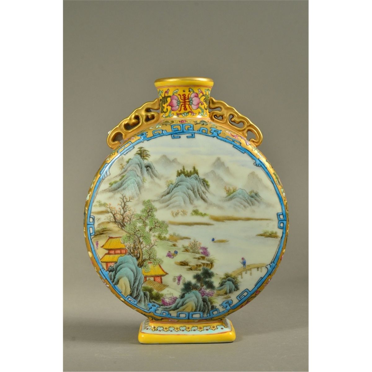 Chinese Qing Period Famille Rose enameled porcelain flask; of circular form: enameled scenery of sea side village with mountains; with flange handles in form of Qilin; H: 24 cm, W: 19 cm, L: 6 cm