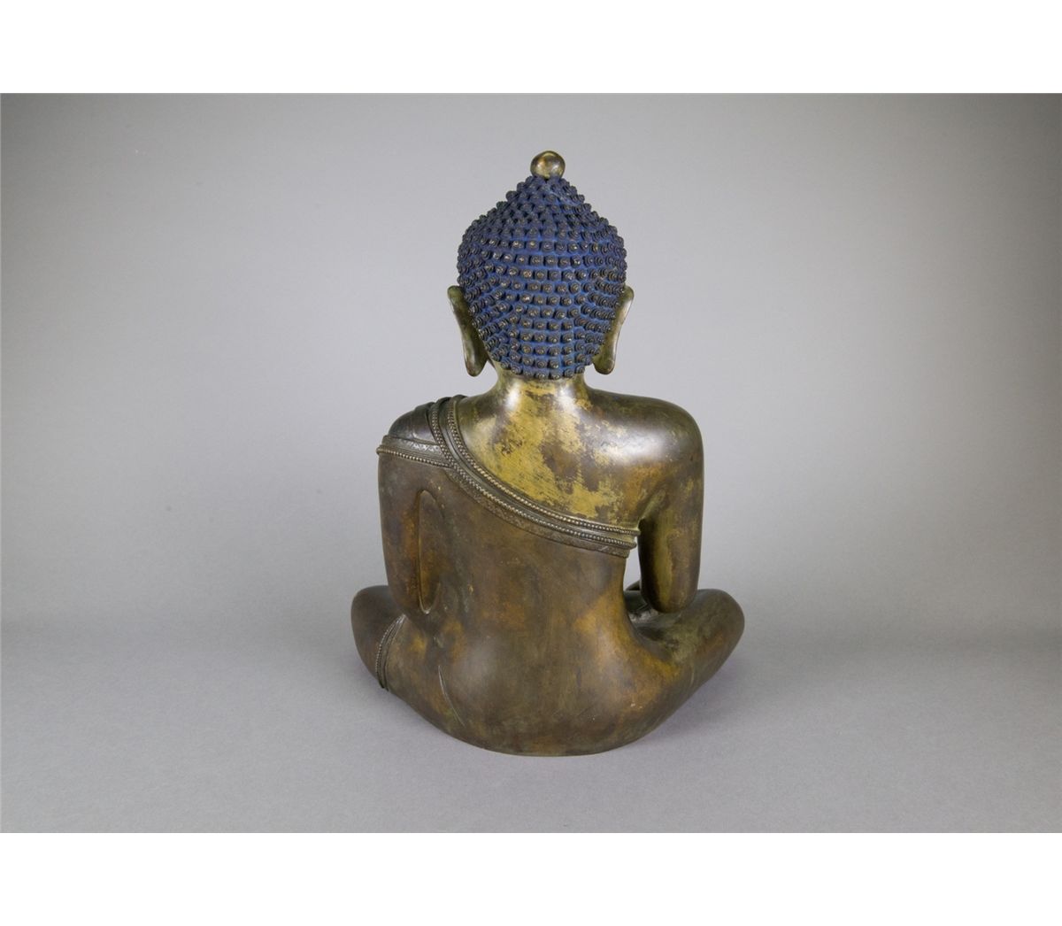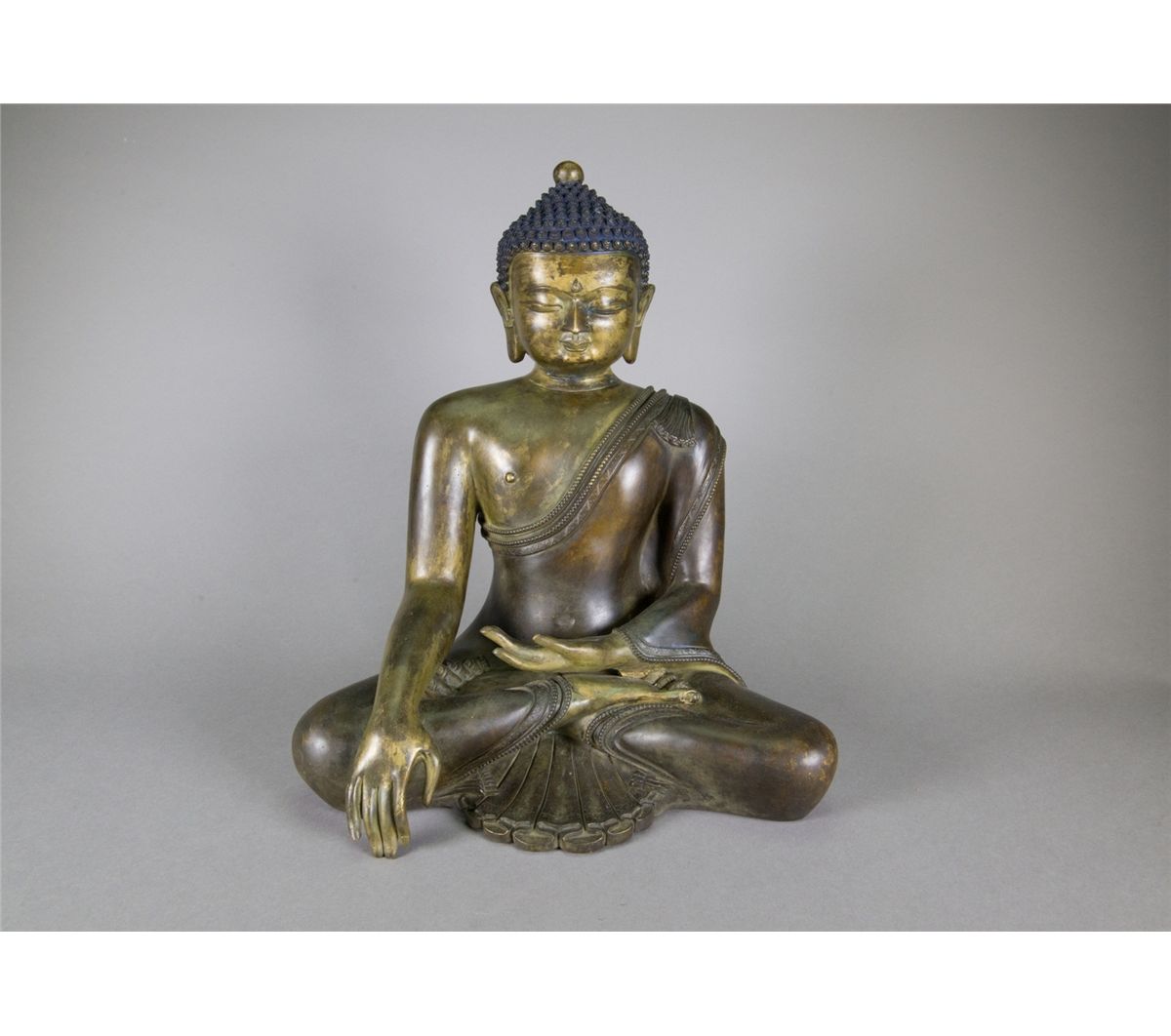 Chinese bronze Buddha figure; featuring seated Buddha with peaceful expression; Qing period; H: 36 cm, W: 29 cm, 5 kg. Provenance: Toronto Private Collection