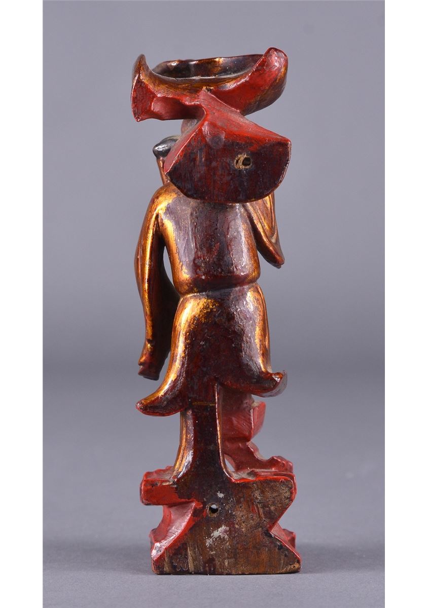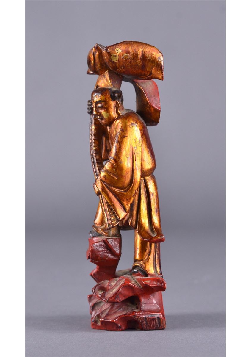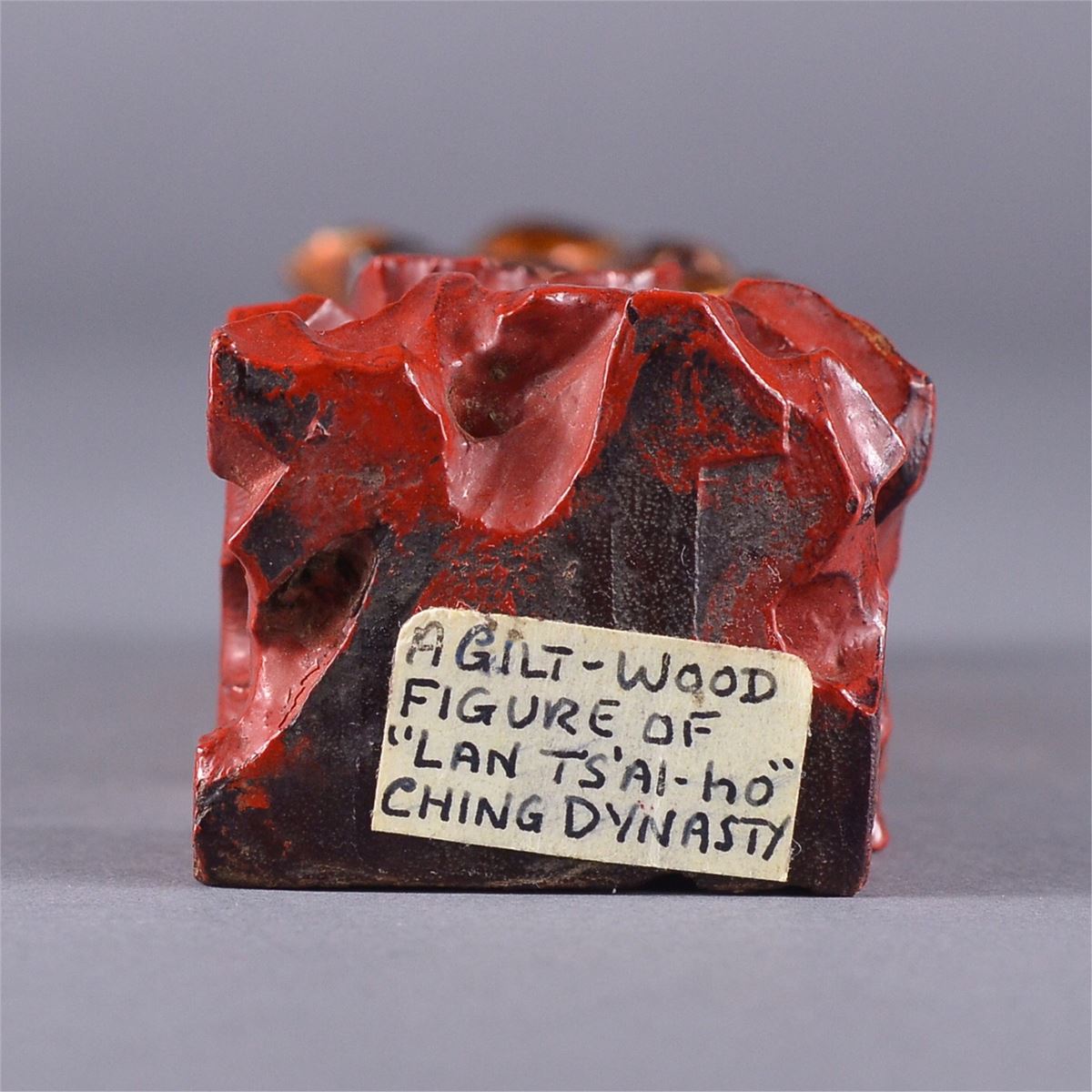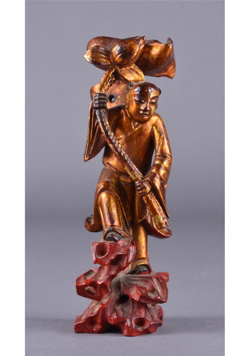 Chinese gilt wood carved figure; featuring one of the Eight Immortals, Lan Ts'ai-ho (Lan Caihe); H: 14.5 cm, 57 grams
