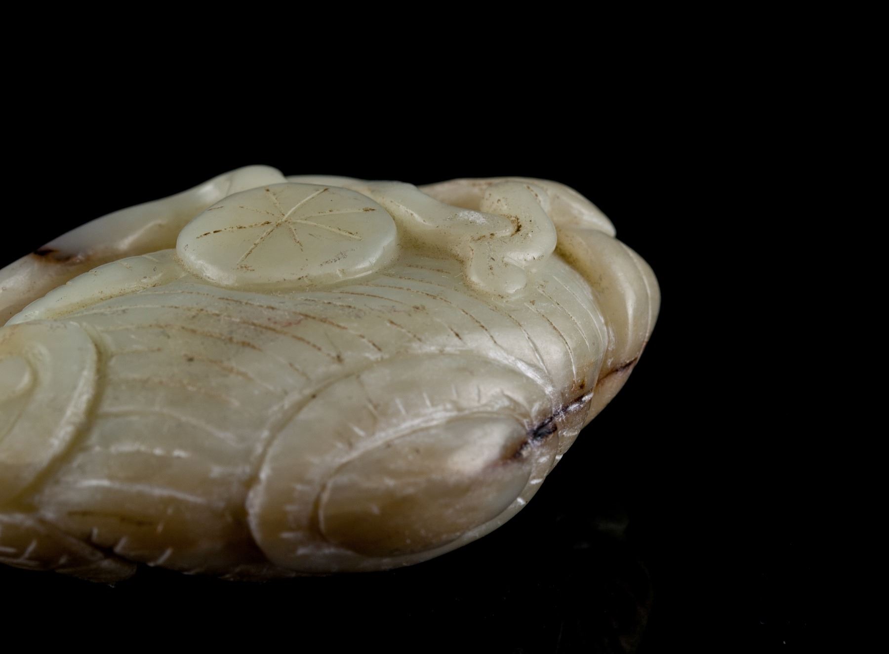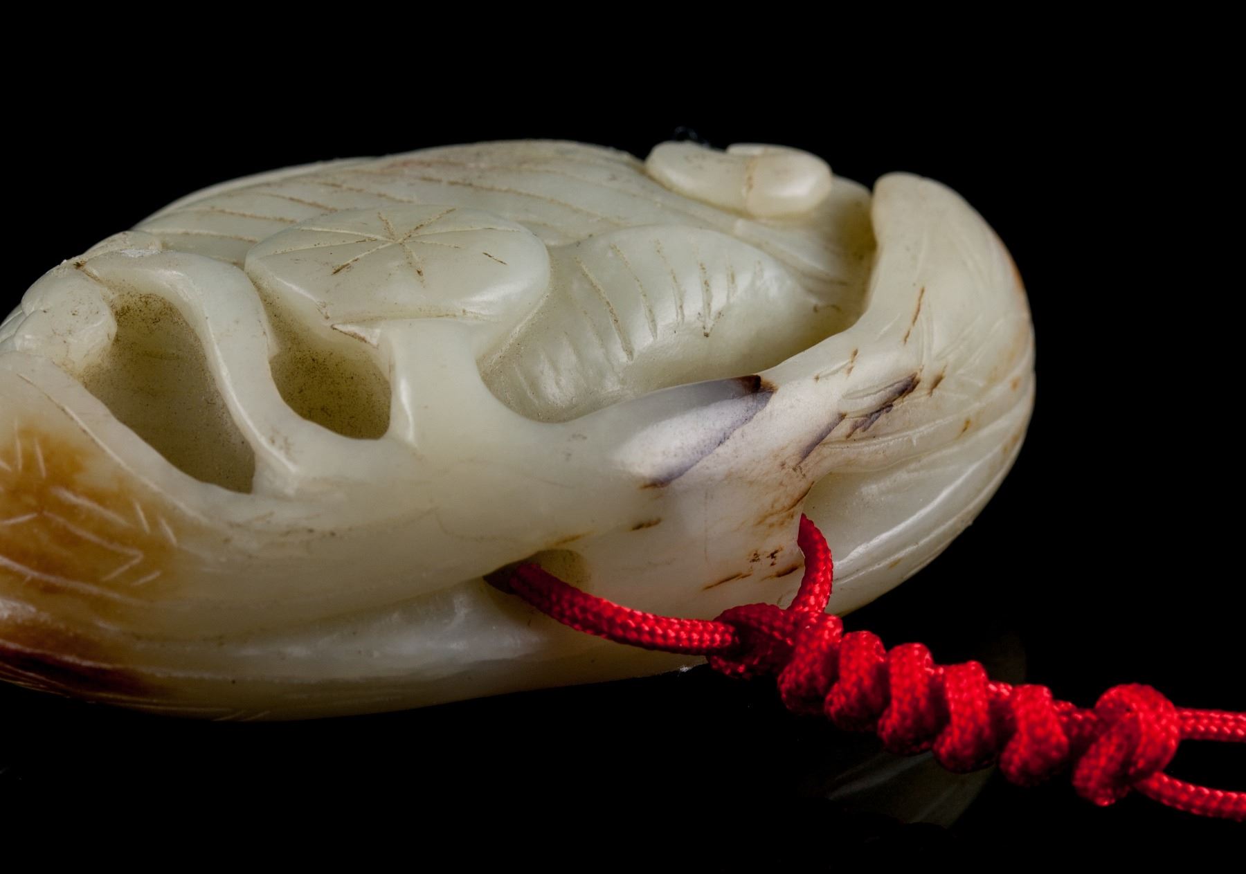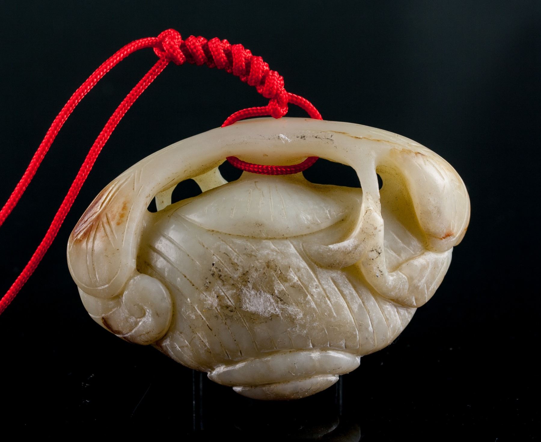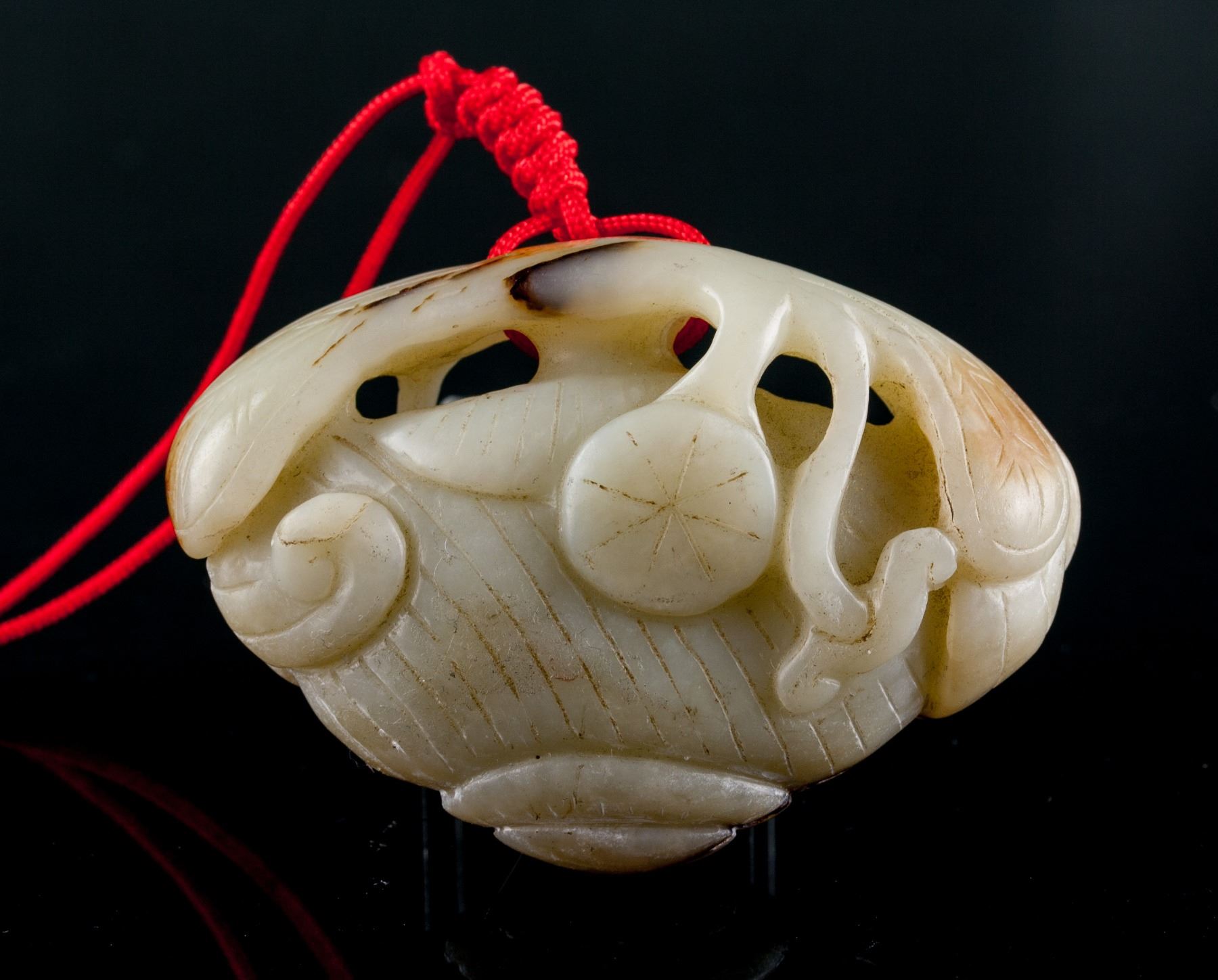 Chinese Hetian white jade carved pendant; carved in lotus form; of white tone with russet tinge; pierced for suspension; Qing period; 2 cm x 7 cm, 93 grams, Density: 2.82