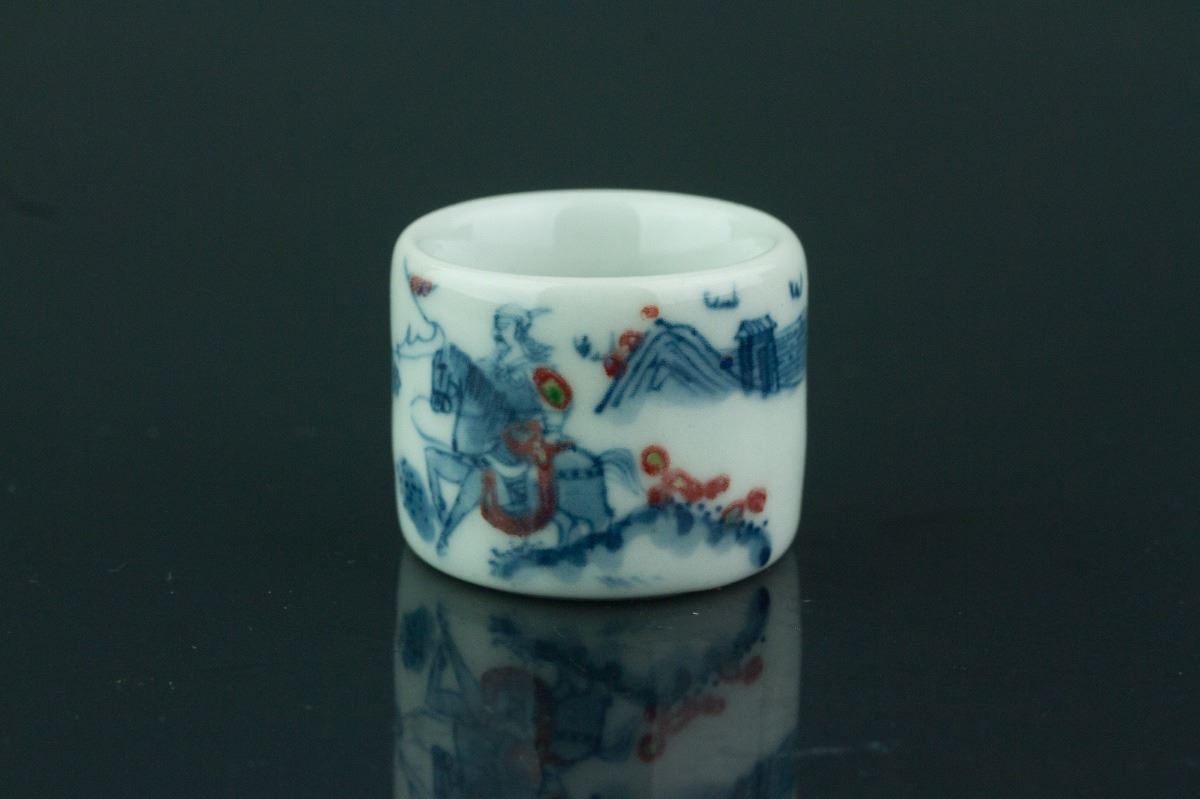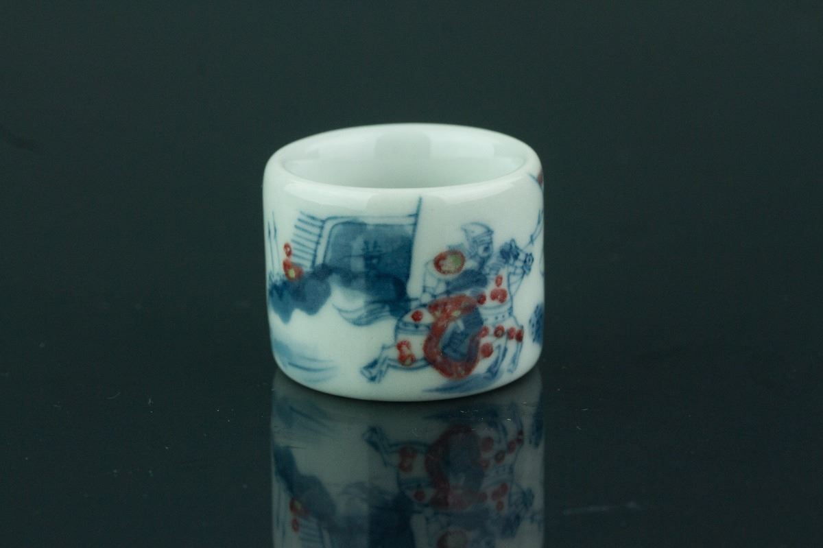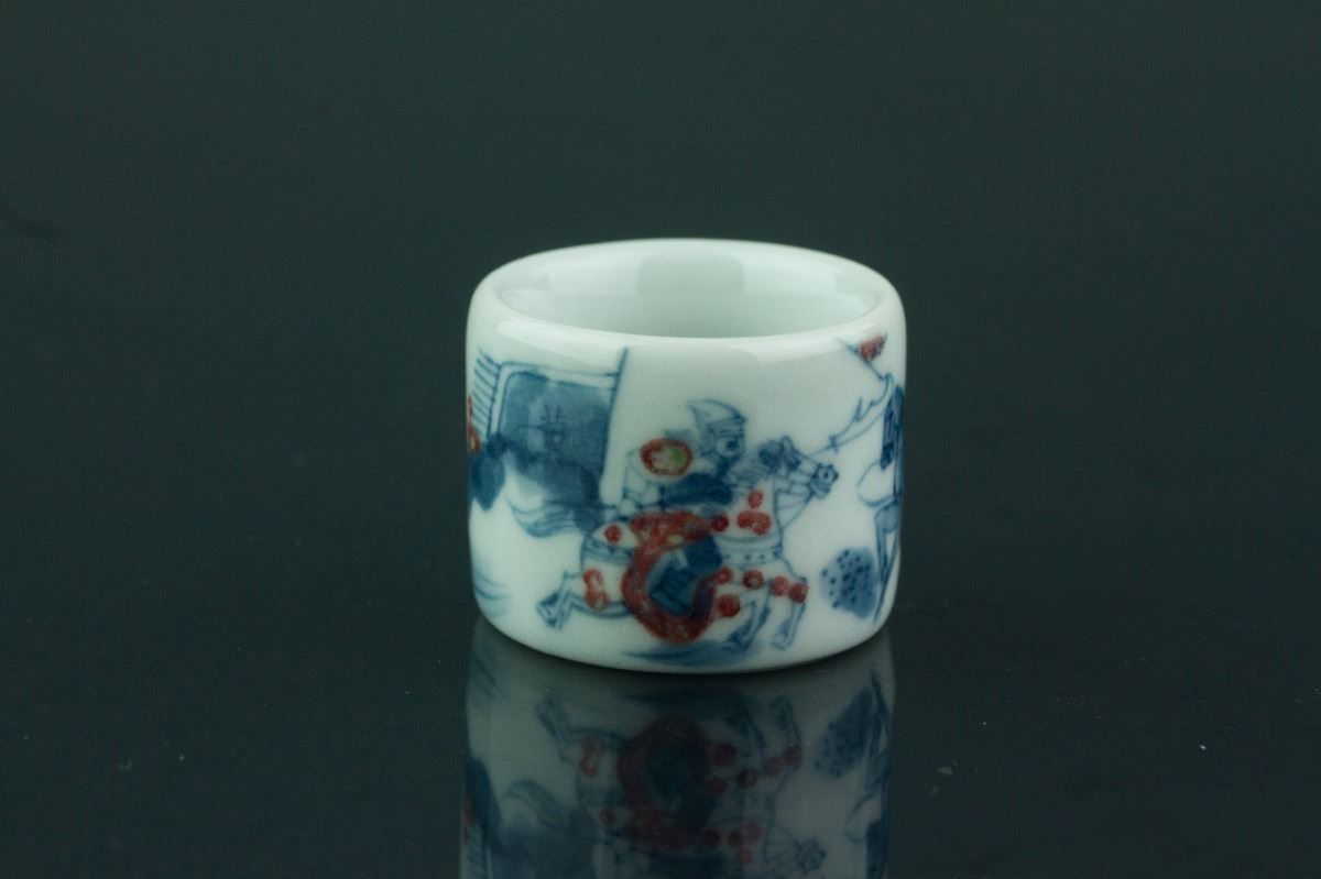 Chinese blue and white copper red porcelain archers' ring; Qing period; painted with armed generals on horseback; Ring Size: 15 cm, 21 grams