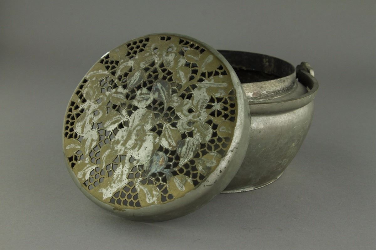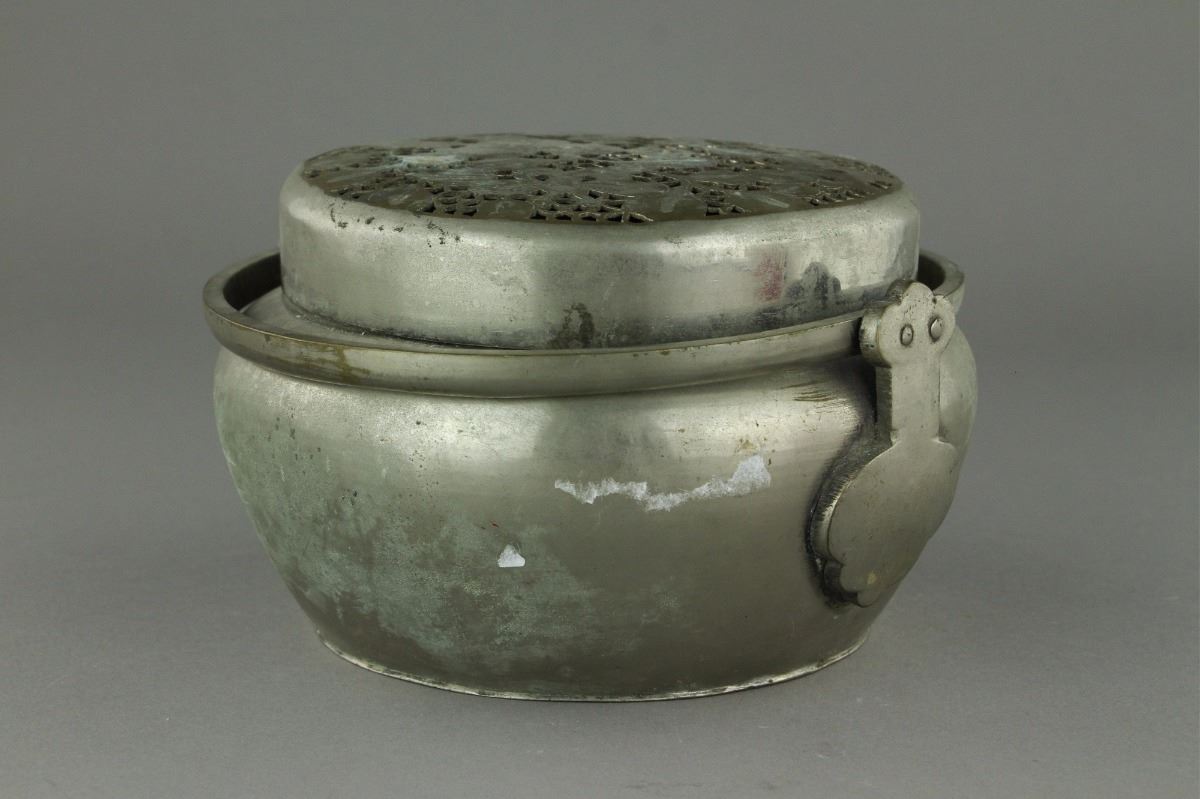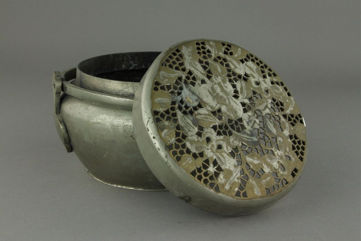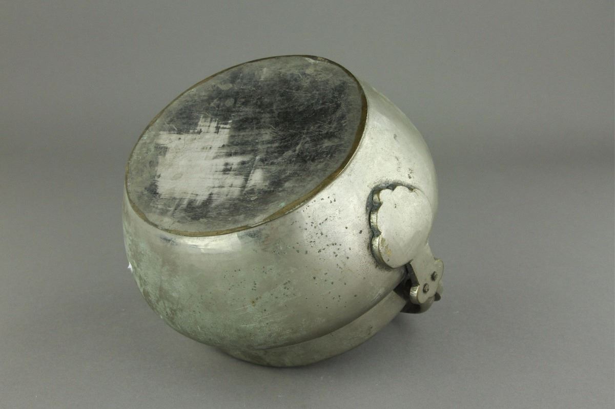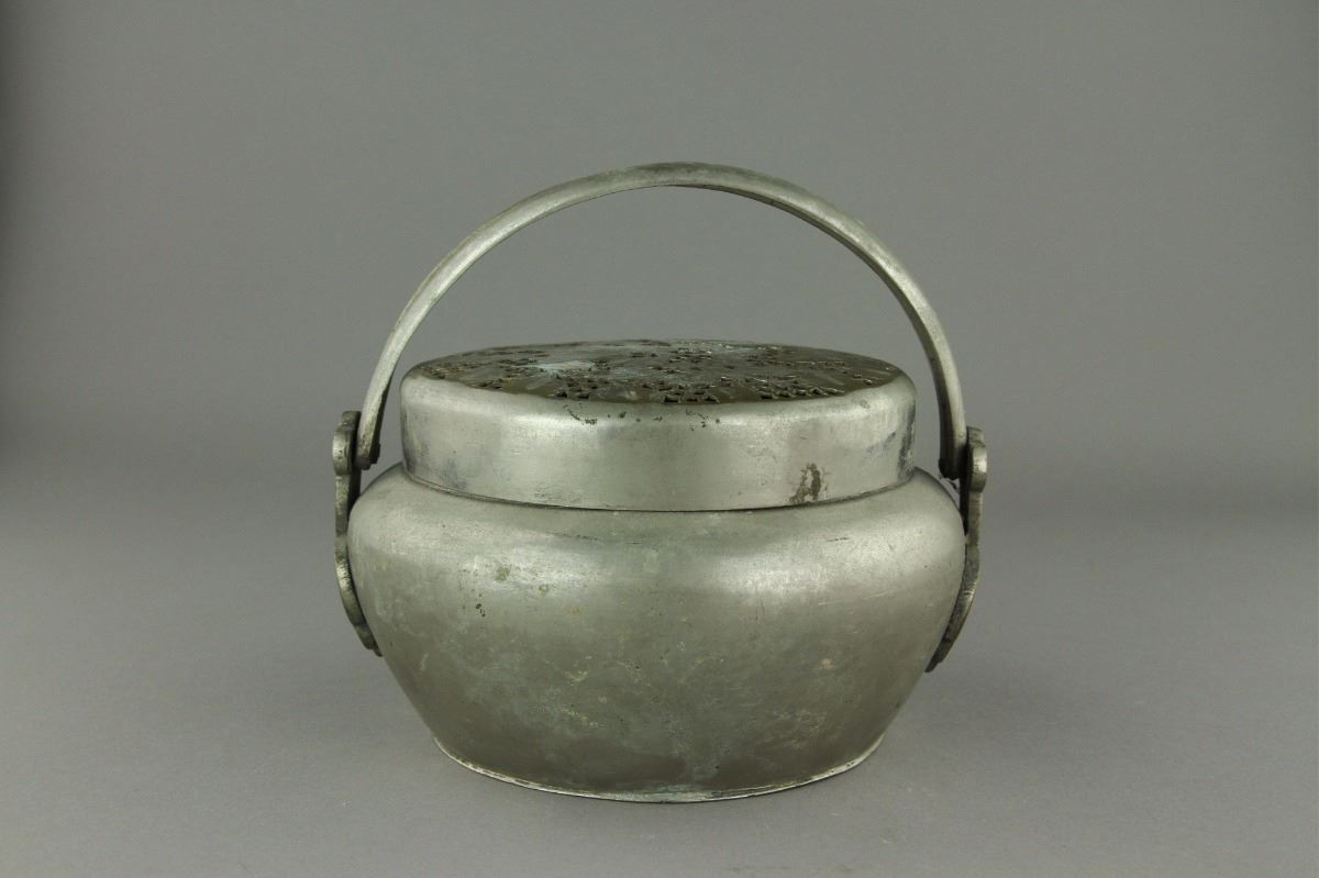 Chinese Qing Period silver pot; domed cover featuring openwork design of branches bearing peaches; upright handle; H: 10 cm, D: 18 cm
