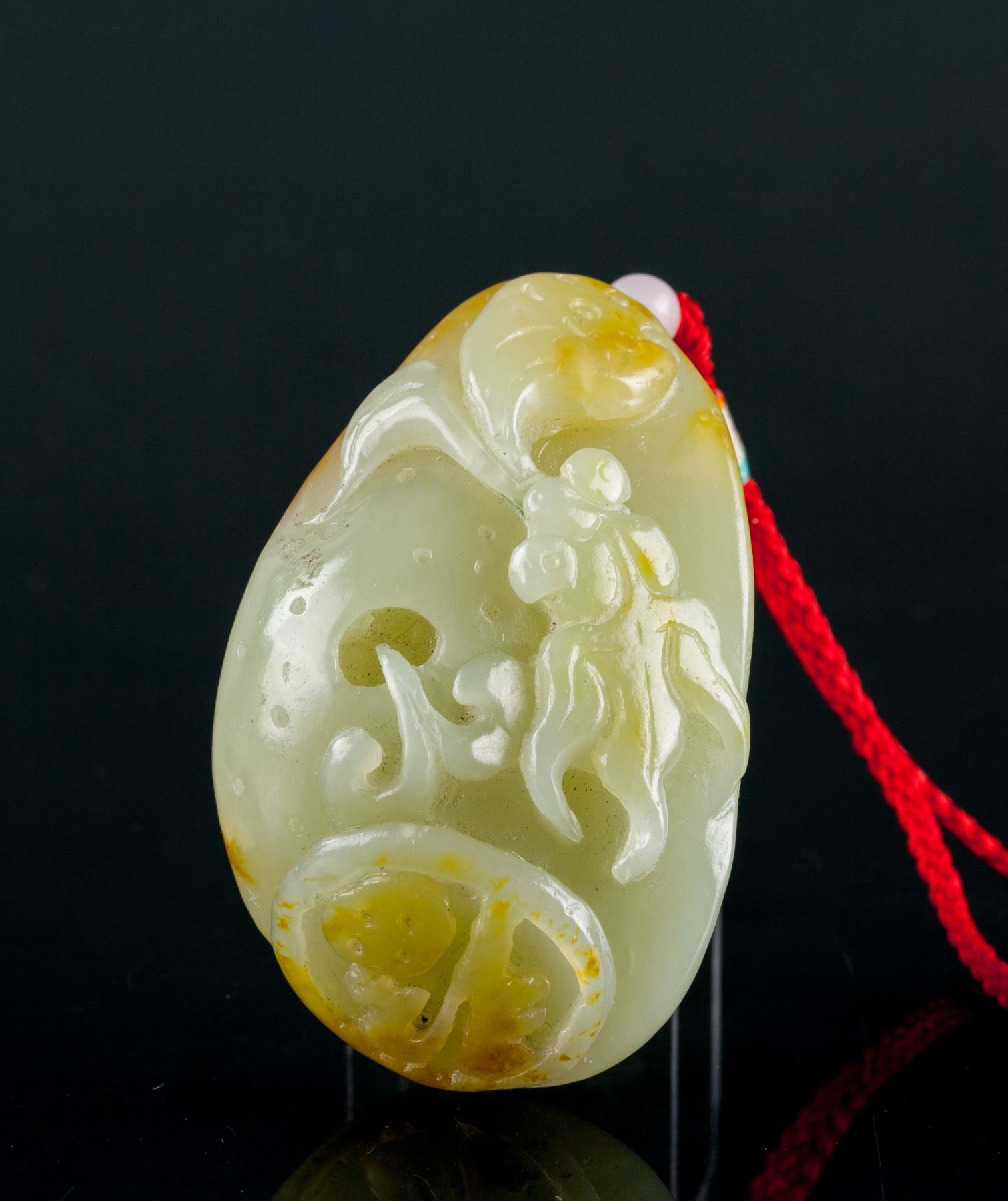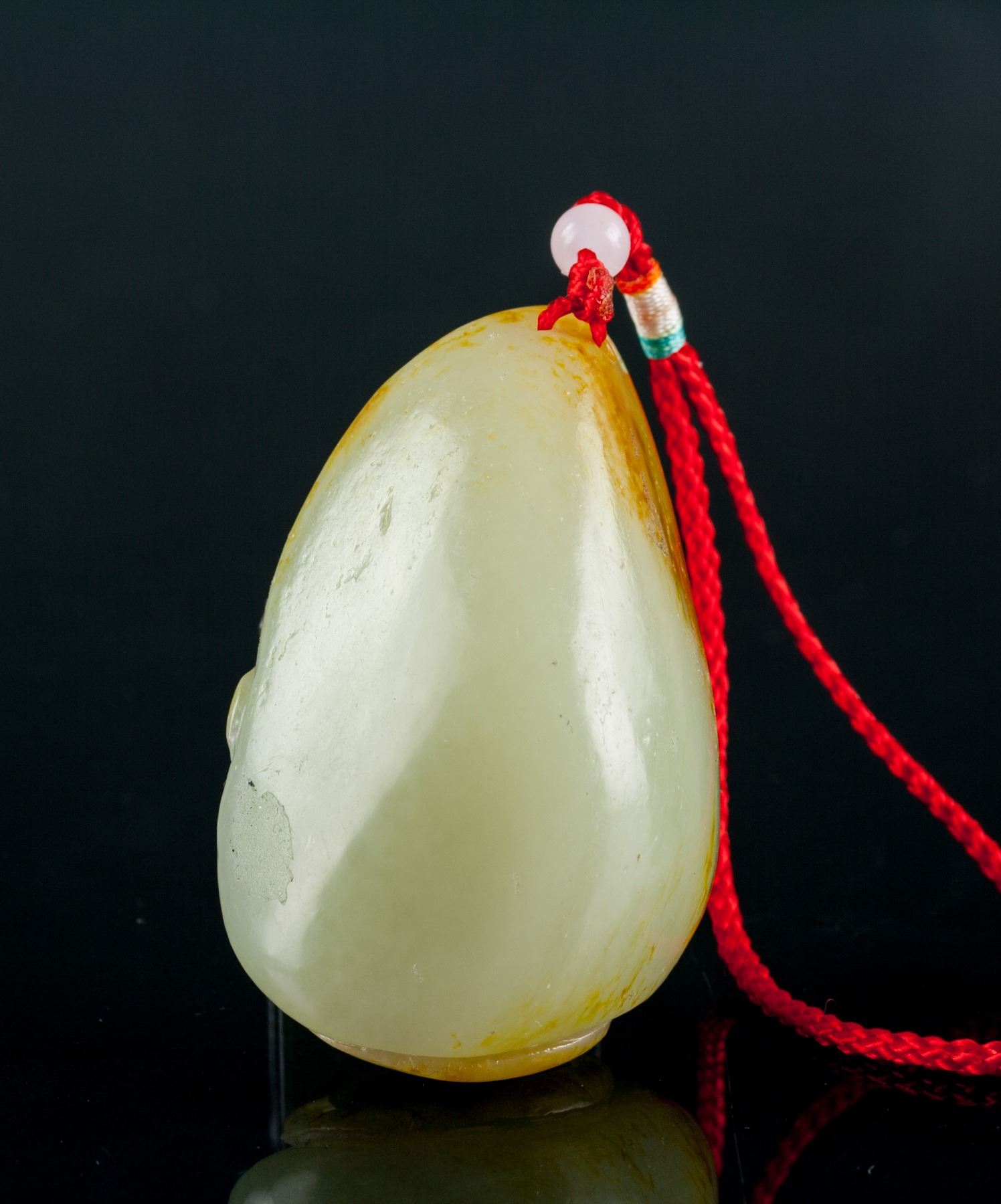 Chinese white and russet jade carved toggle; of ovoid shape body; carved with lotus, ruyi, Chinese character "Fu" (happiness) on surface in high relief; Qing period; 2.5 cm x 6 cm, 94 grams, Density: 2.84