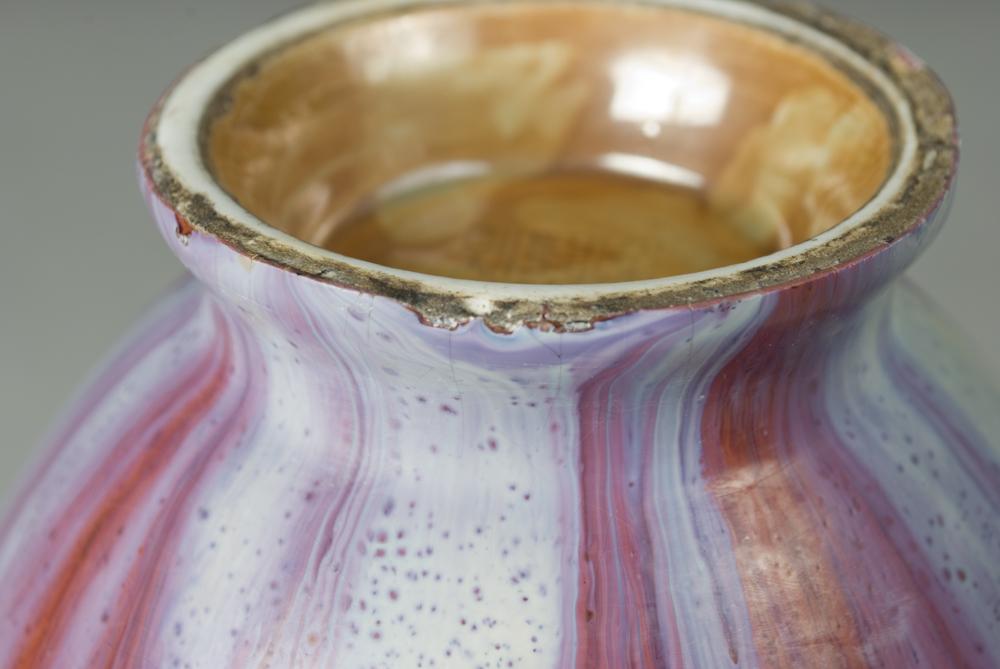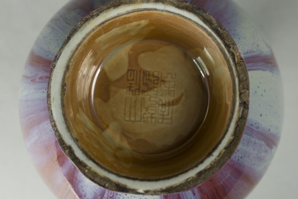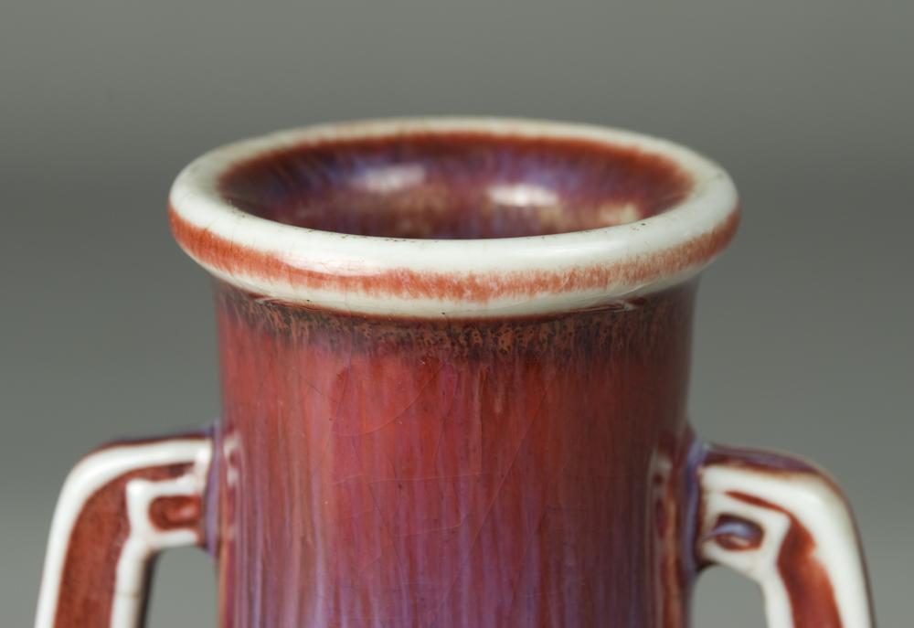 Bottle form with raspberry and white flambe glaze, with two handles and a two ribbed center. Impressed mark for Great Qianlong production on underside. 8.75" H x 5" W. 19th/20th Century.