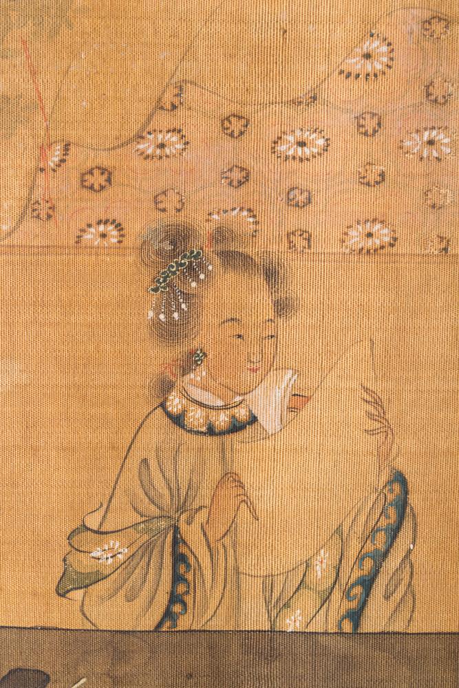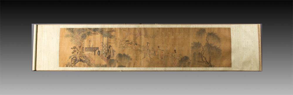 Depicting Figures in a Garden, 16.5" W x 70.5" L. Circa 18th - Early 19th Century. Displayed in Plexiglass Case.