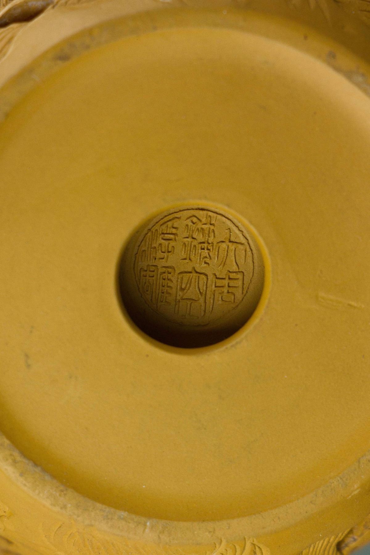 Chinese rare yellow Zisha teapot with cover; of ovoid body with curved handle and short spout; openwork carved with striding dragon chasing a flaming pearl; the base with a six-character seal mark; H: 11 cm, W: 15 cm, 396 grams