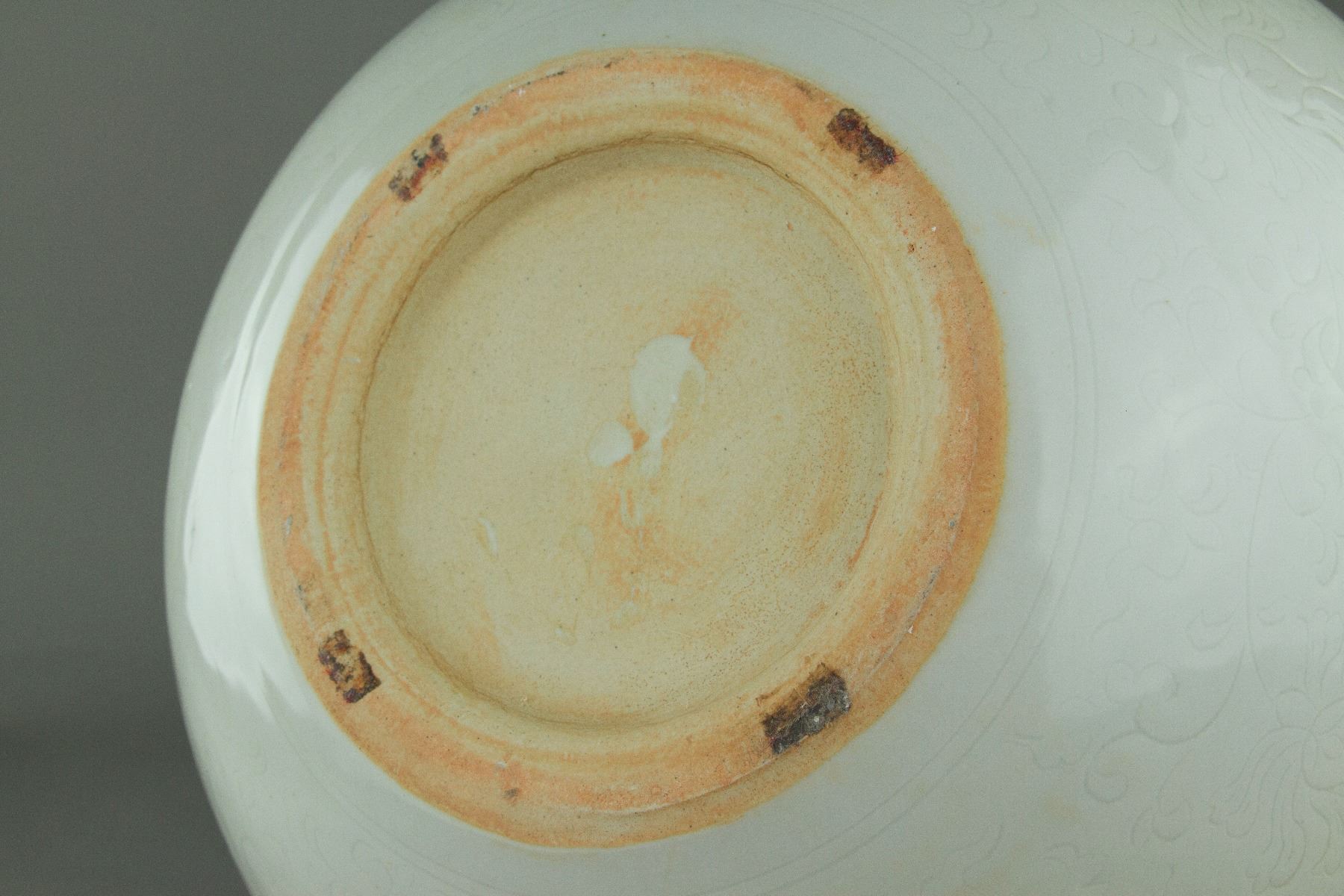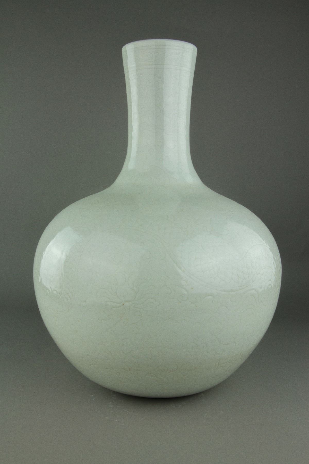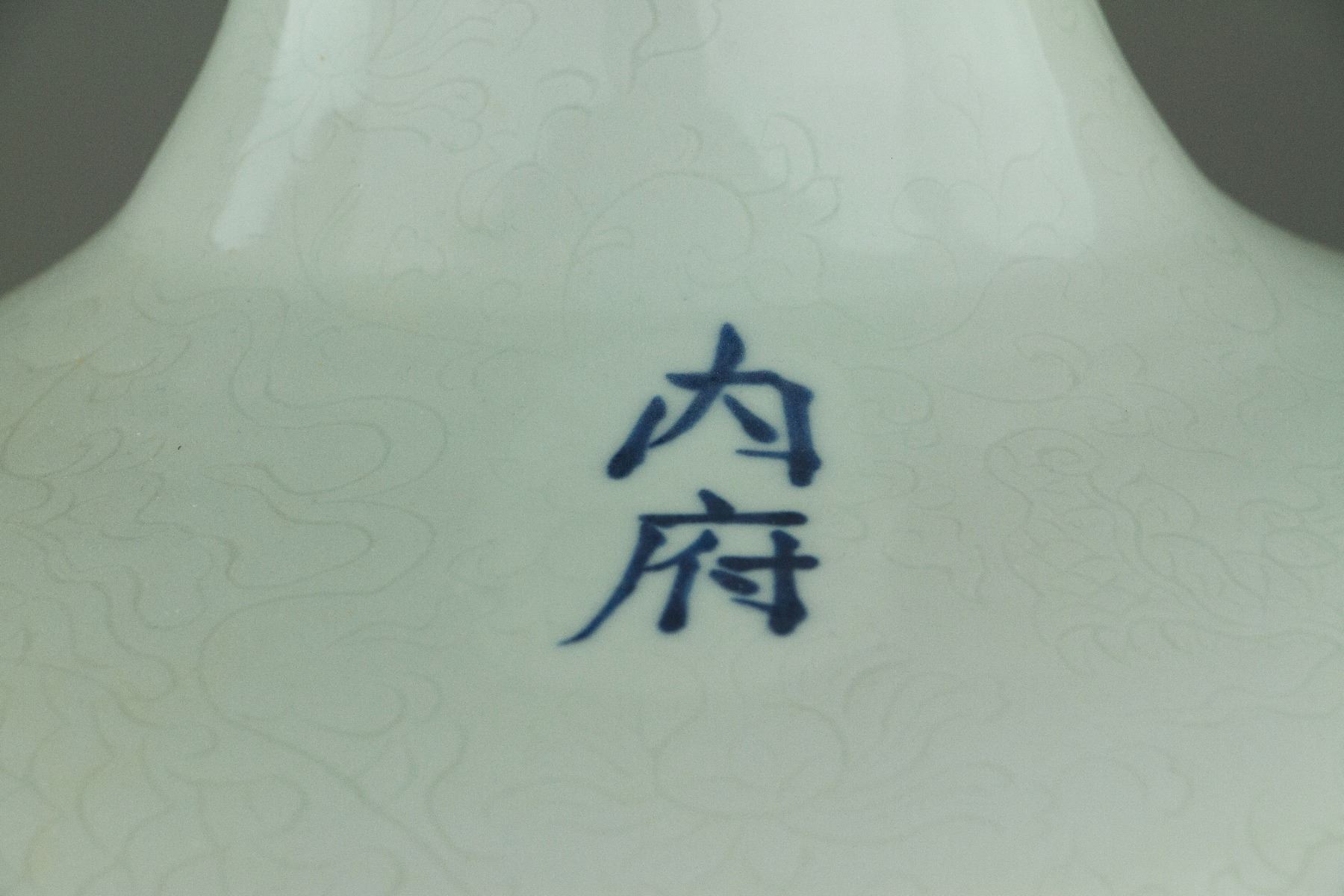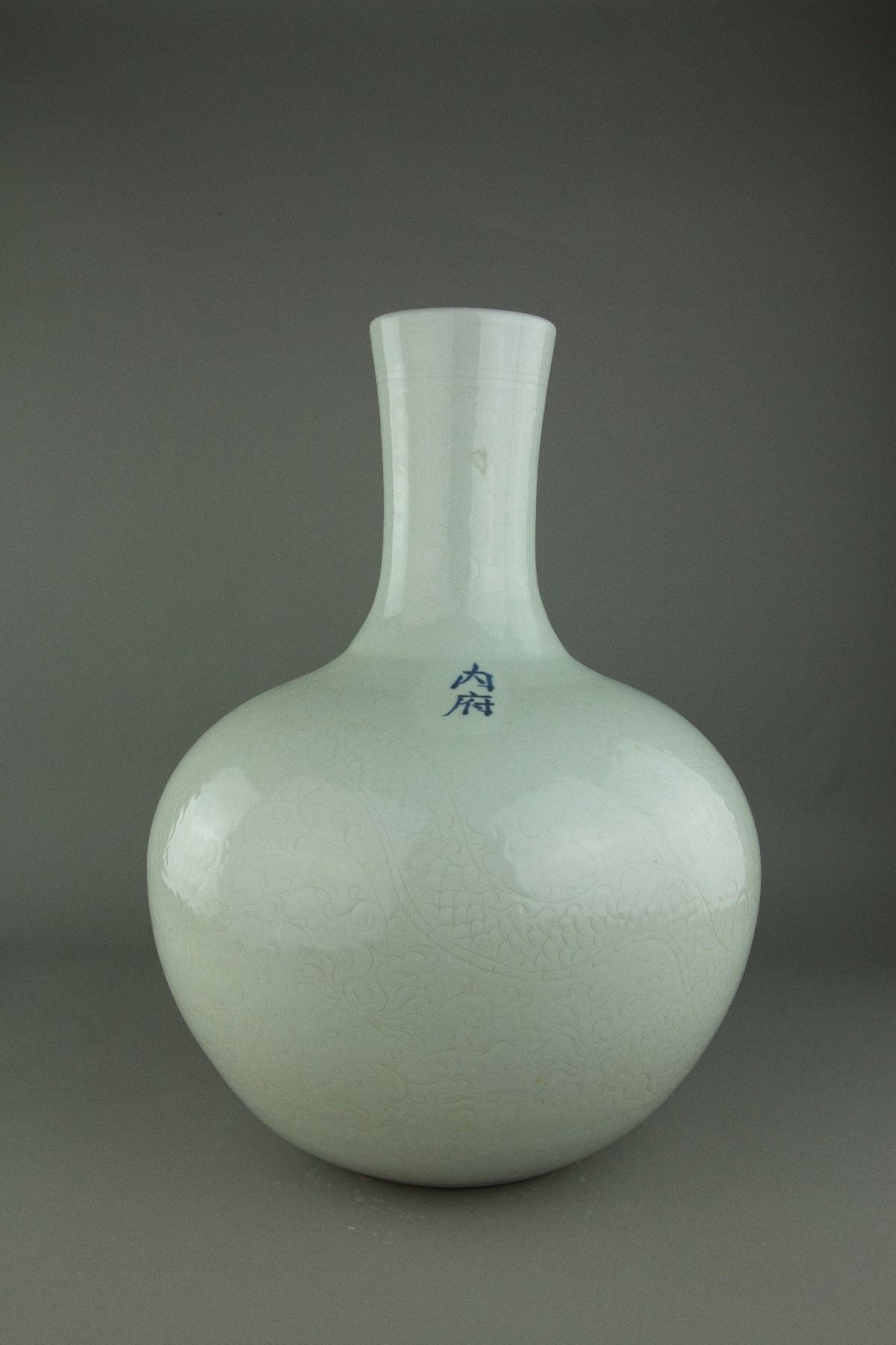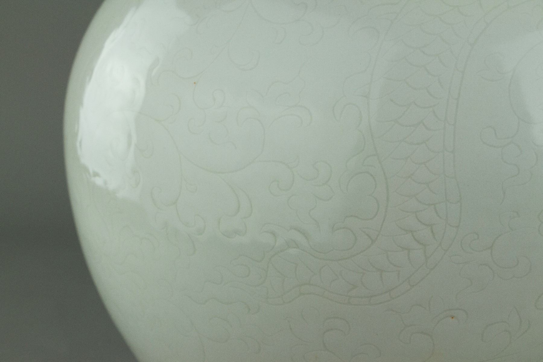 Chinese rare imperial porcelain vase; Ming/Qing Period; of globular body connecting to a slightly waisted neck; the body covered in white glaze subtly incised with striding dragon amidst floral scrollwork; two-character Nei Fu mark in cobalt blue on shoulder; unglazed base; H: 49 cm, W: 40 cm, 5.5 kilograms