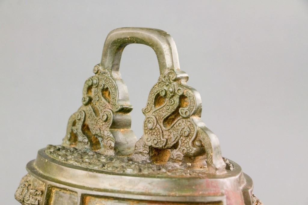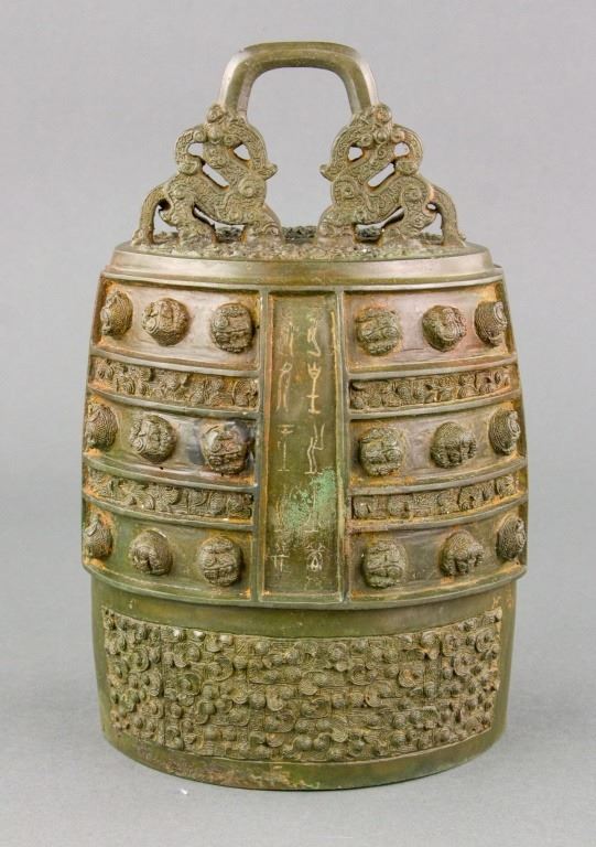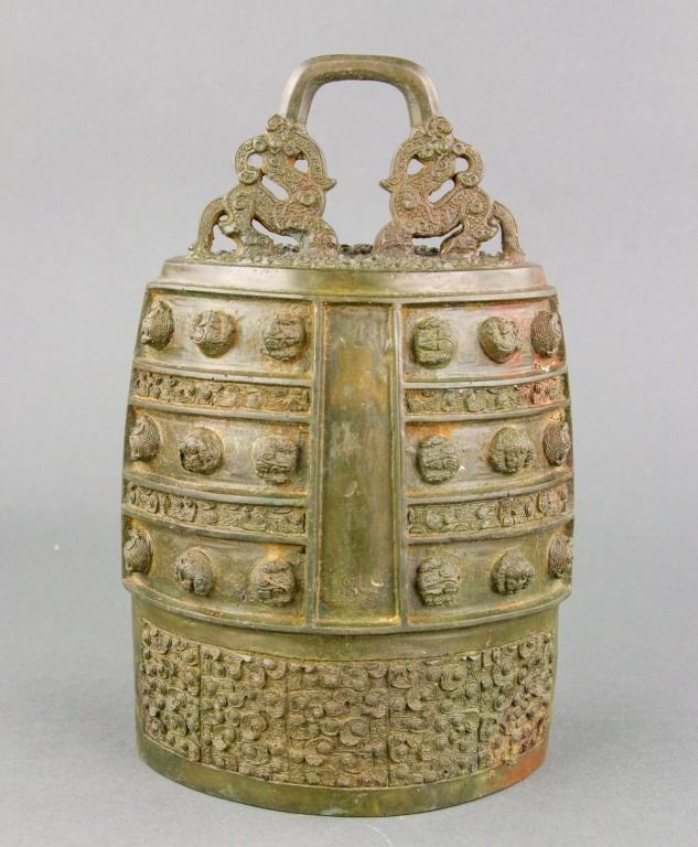 Chinese rare bronze ritual bell; Han to Tang dynasty; of pointed oval section, each side decorated with six horizontal panels enclosing three bosses cast in the form of coiled beast; separated by narrow bands of raised swirling pattern with a central plain vertical panel incised with seal scripts; the lower part of the bell further decorated with similar intertwining pattern; surmounted by a curved handle decorated by a pair of stylized chilong; overall with a pale grayish-green patina; H: 27 cm, W: 12 cm, L :17 cm, 3300 grams