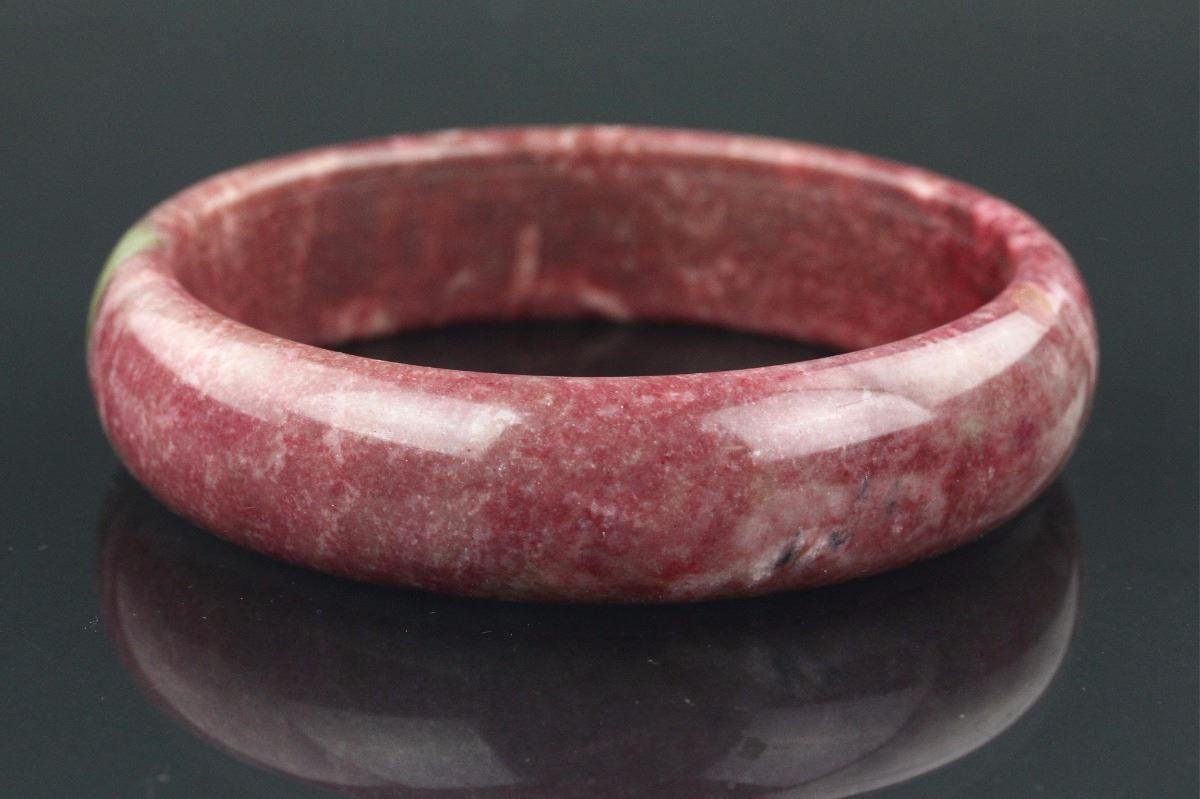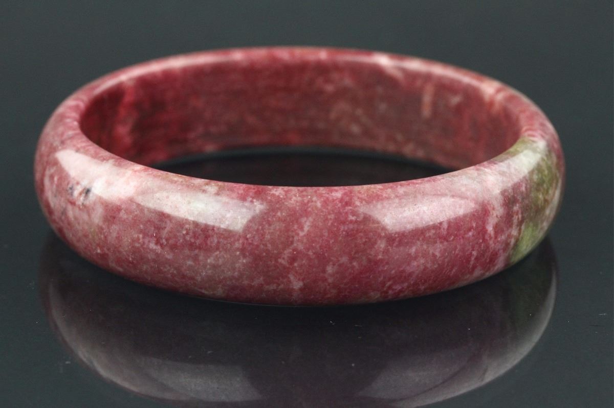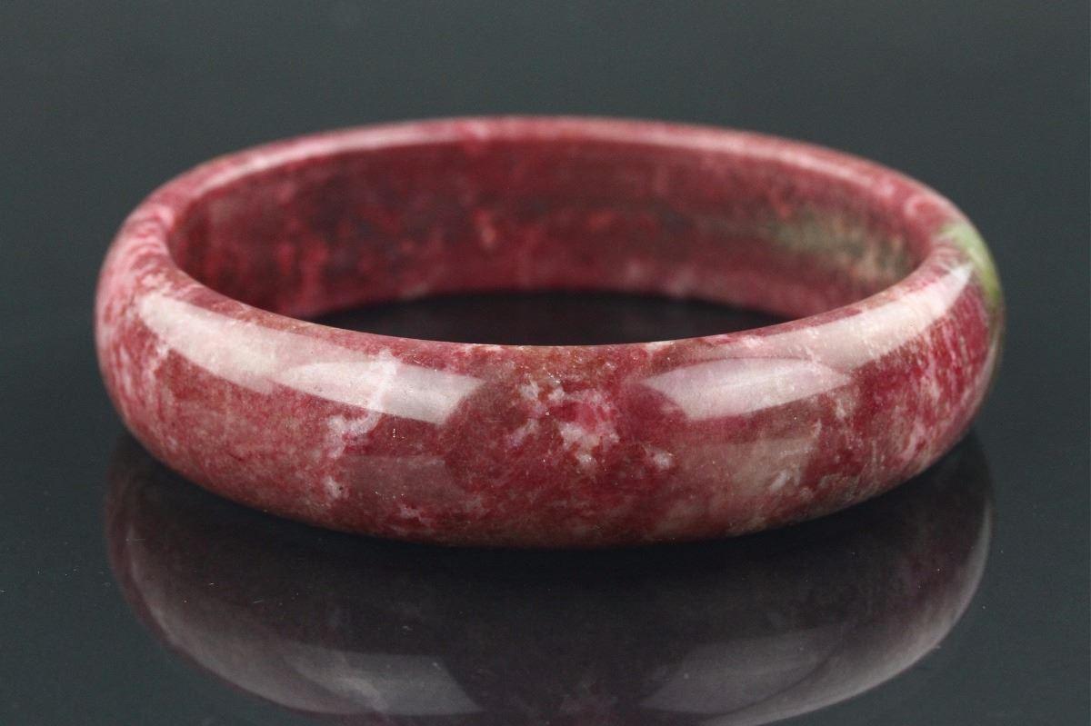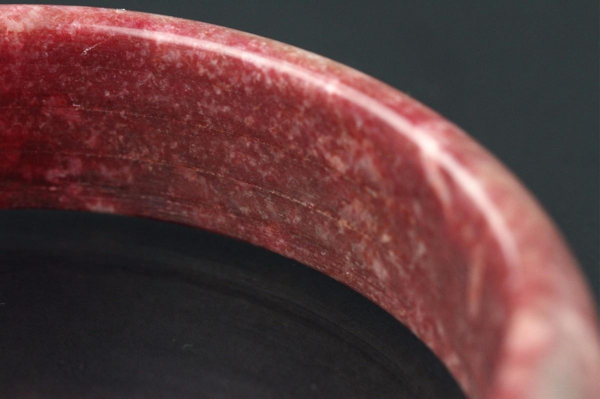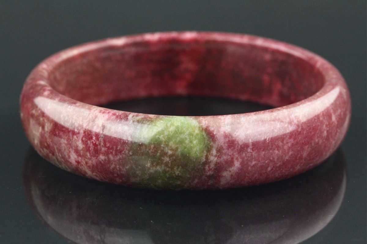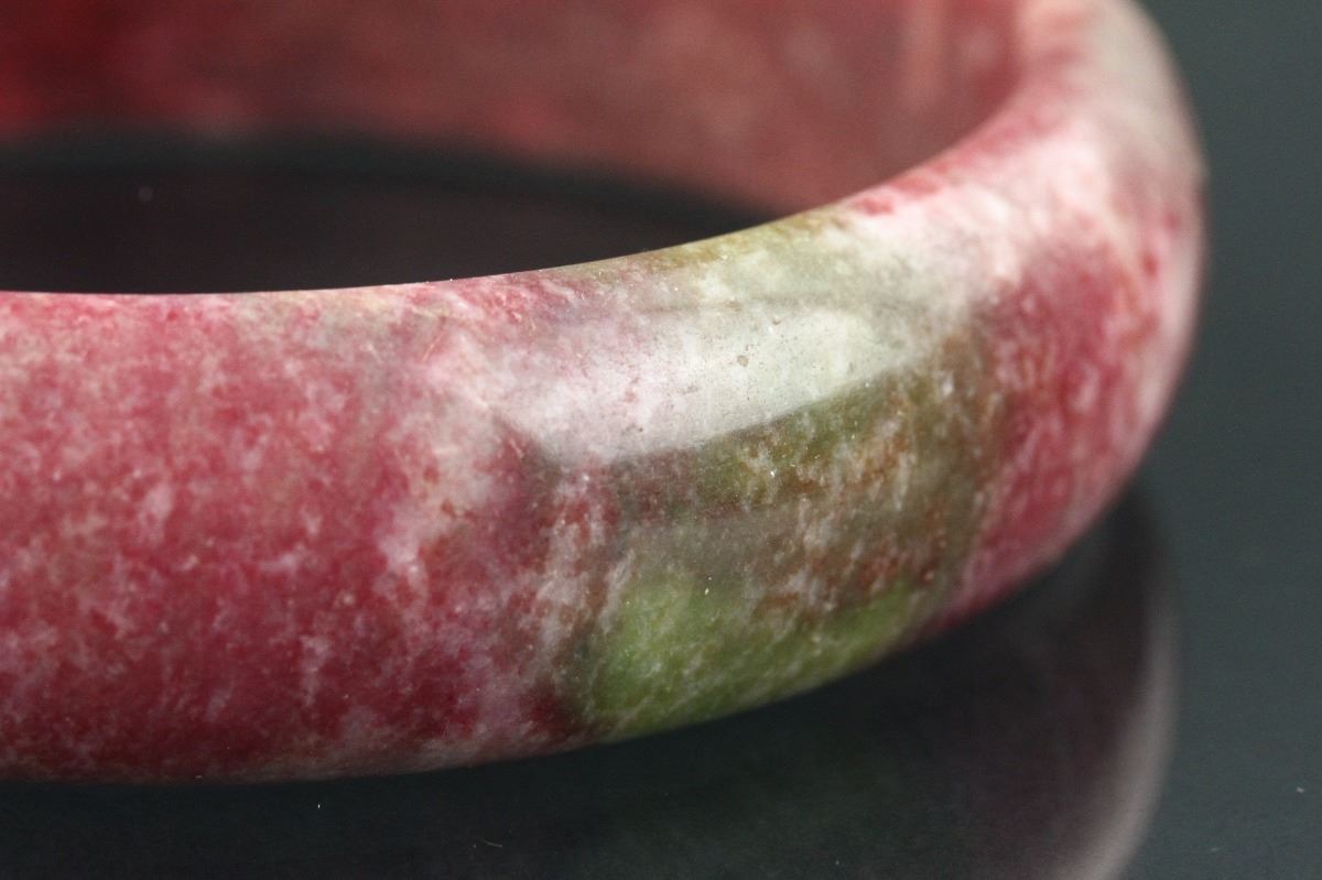 Chinese agate bangle; of circular form; rounded outside and flatten inside; of red tone with olive green suffusion; H: 1.5 cm, D: 9 cm, 150 grams