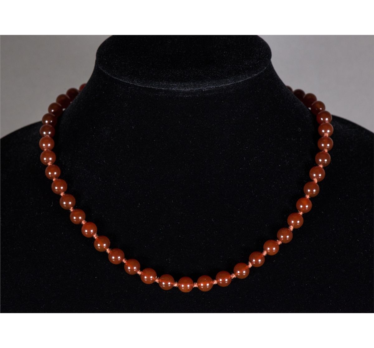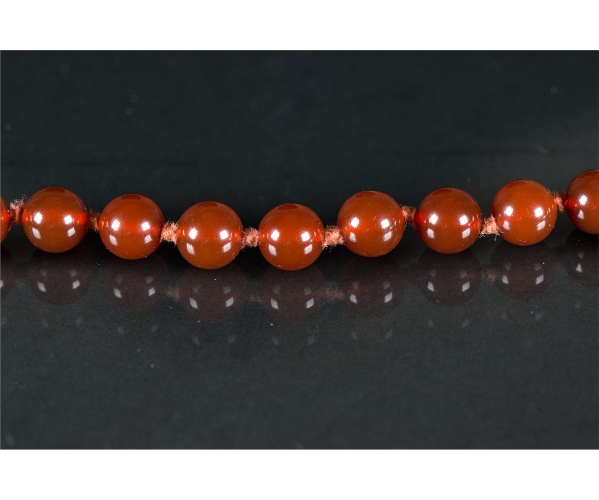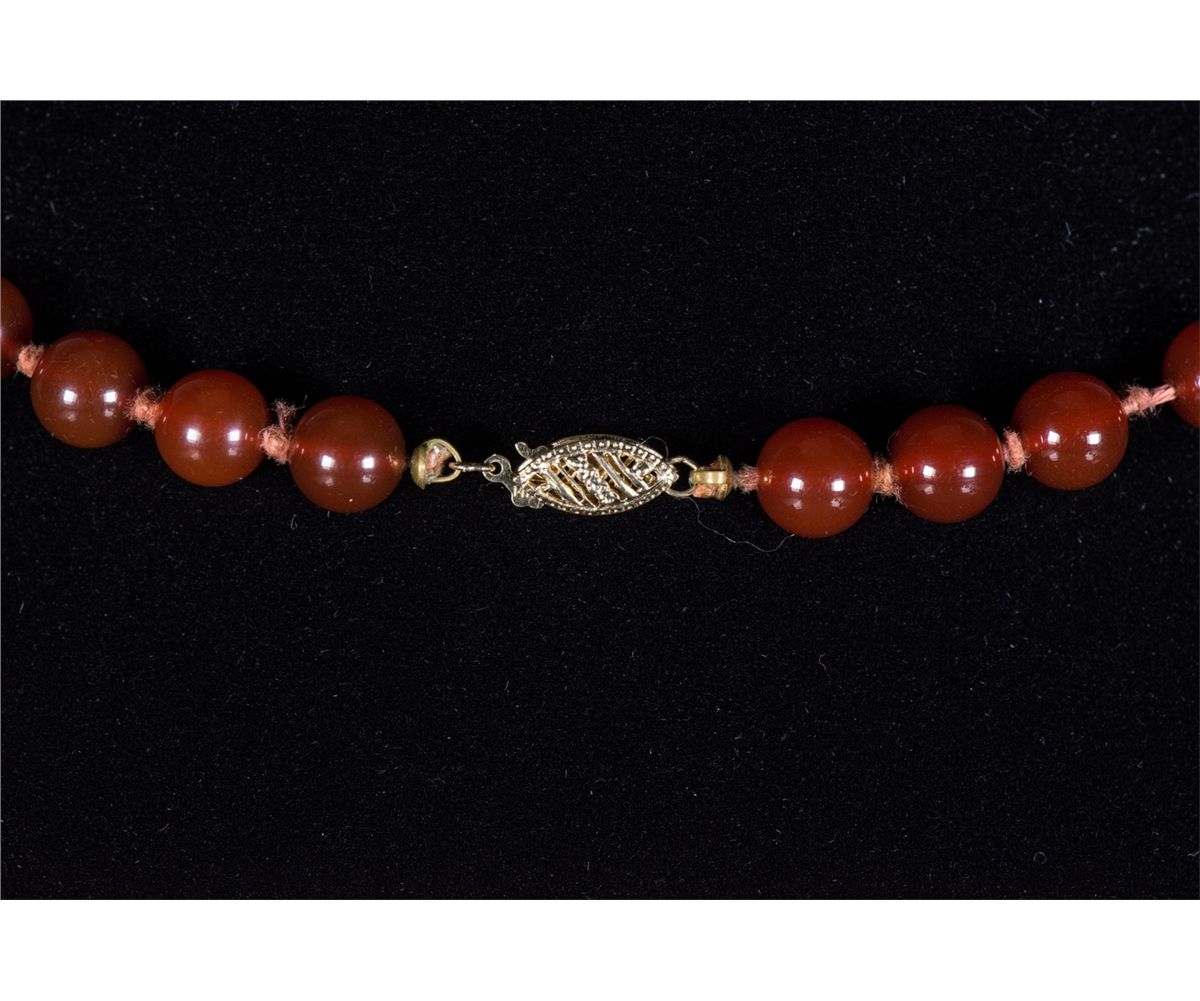 Chinese red agate bead necklace; comprised of rounded red agate beads; with 14K gold clasp; D: 15 cm, 33 grams