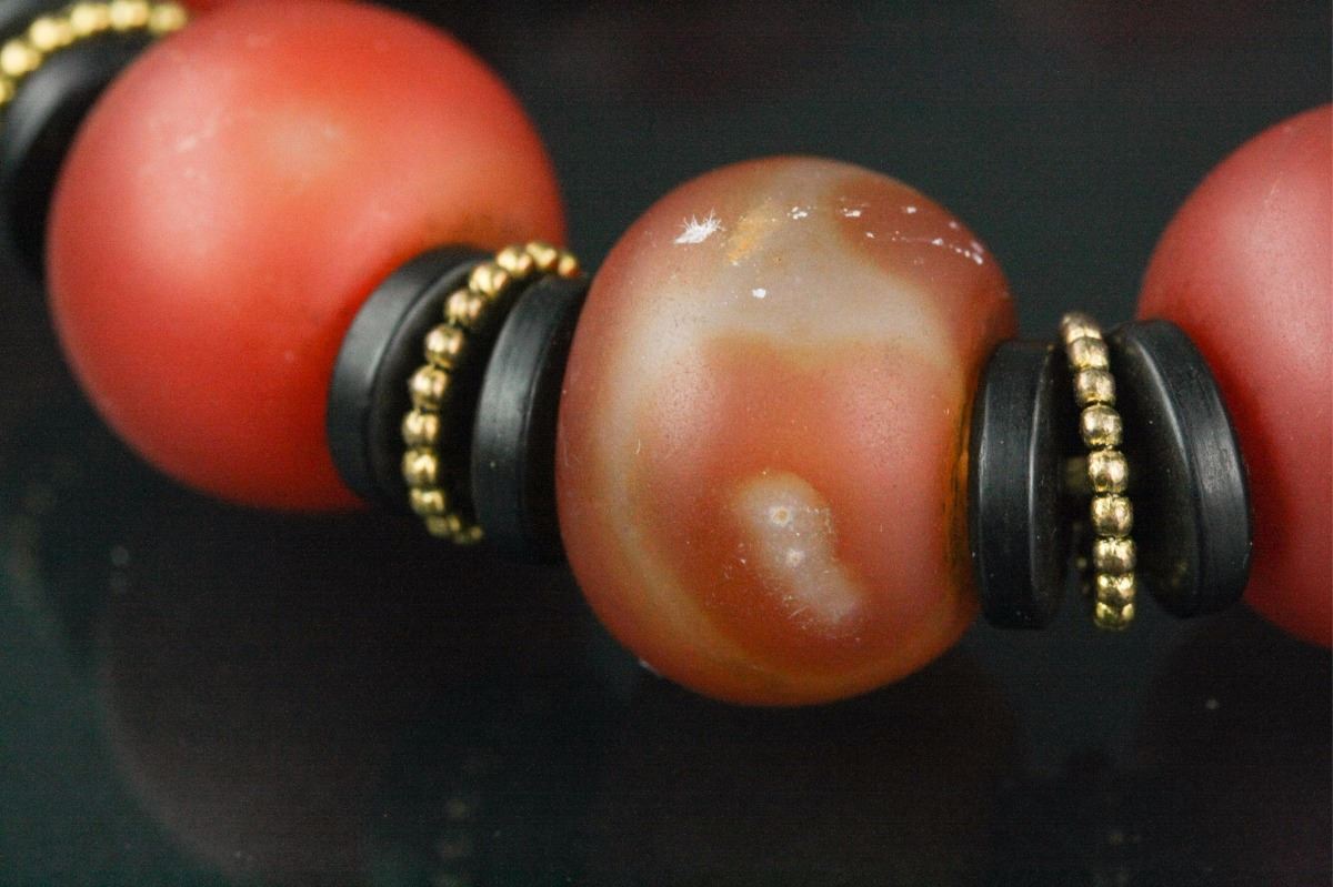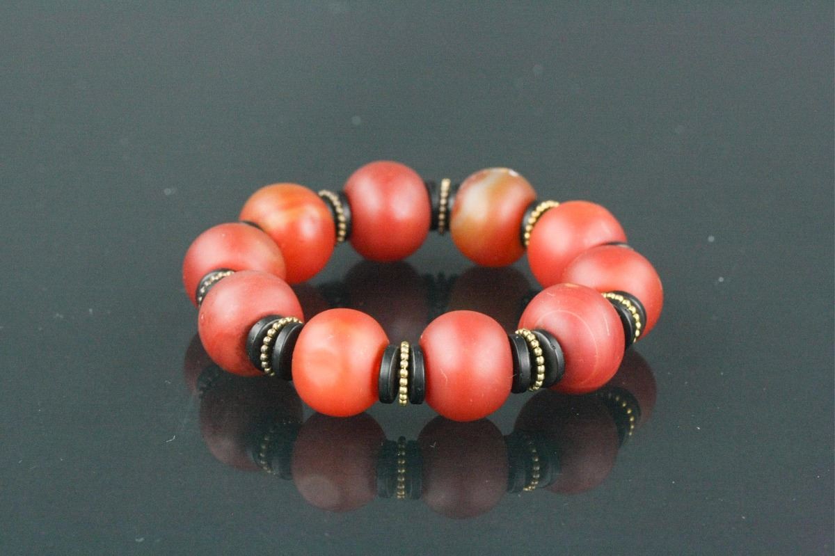Chinese agate bracelet; comprised of rounded red agate beads; D: 6 cm, Bead D: 1.8 cm, 90 grams