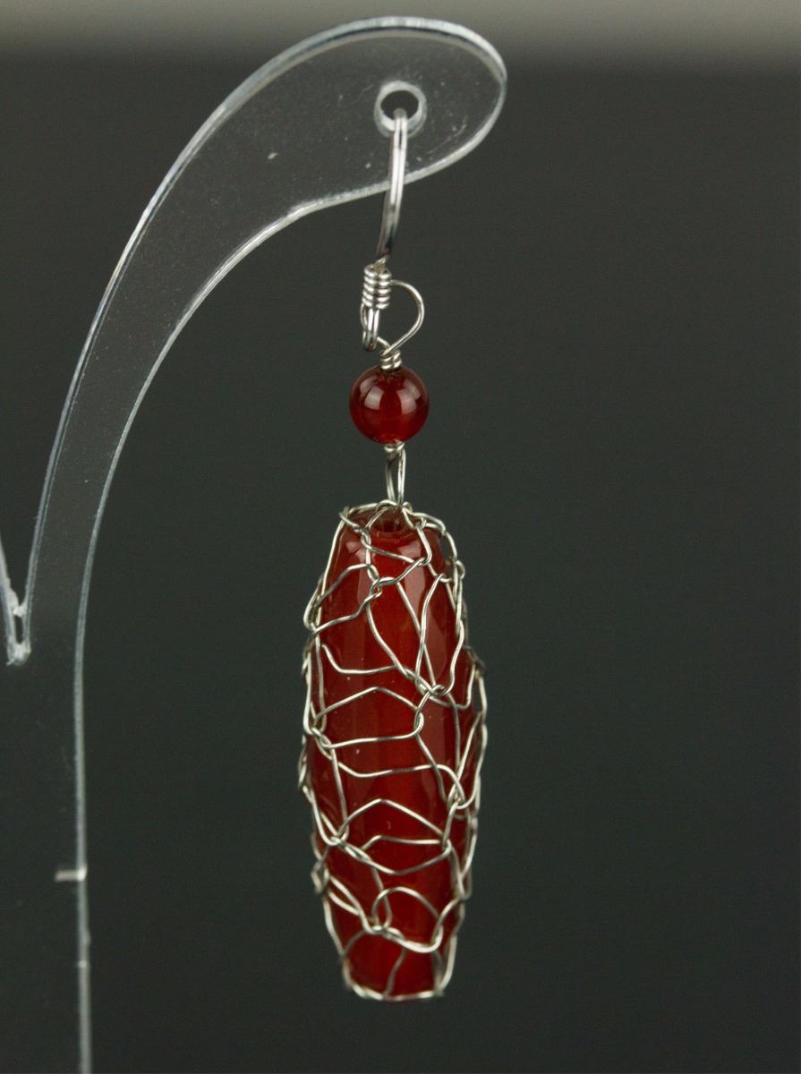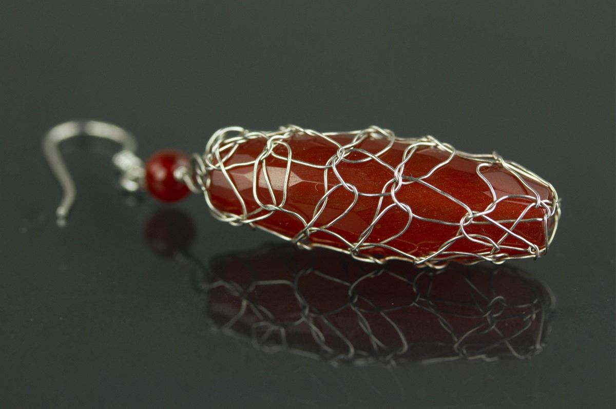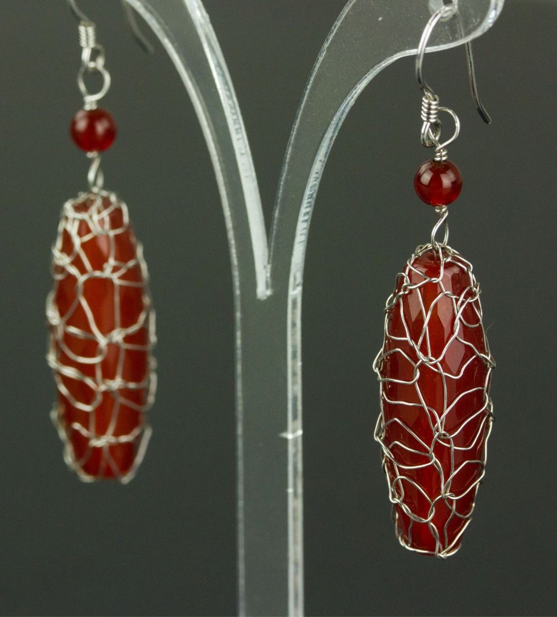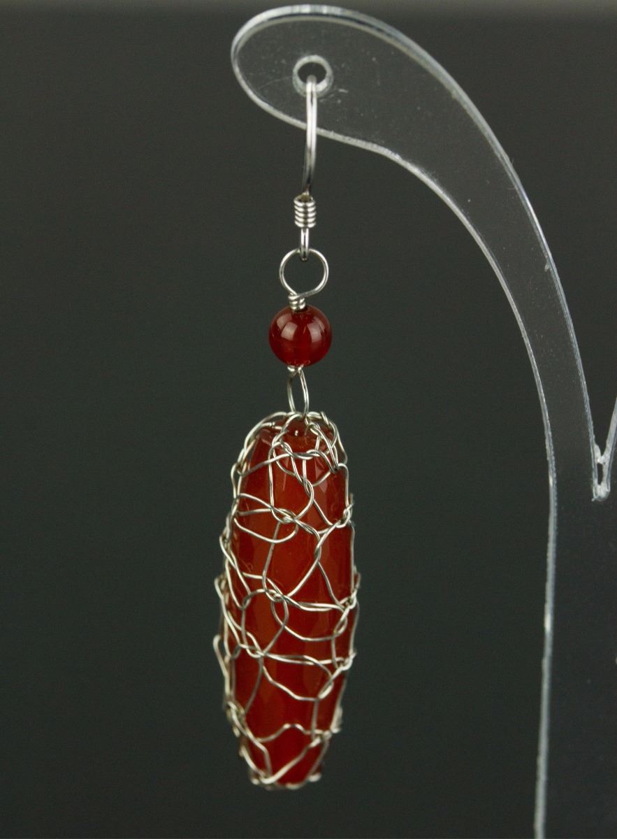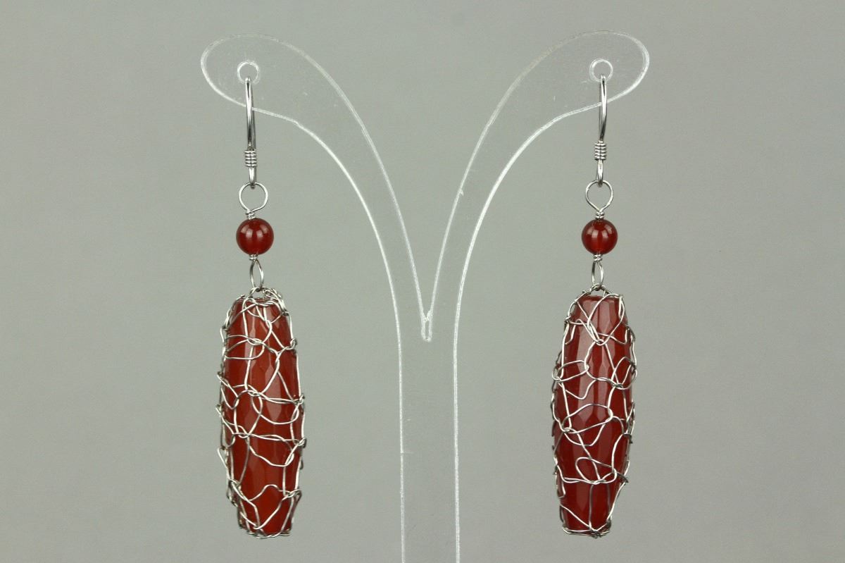 Chinese red agate earrings; of elongated oval form; covered in silver wires; H: 3 cm, W: 3 cm, Both 10 grams