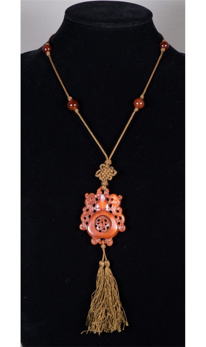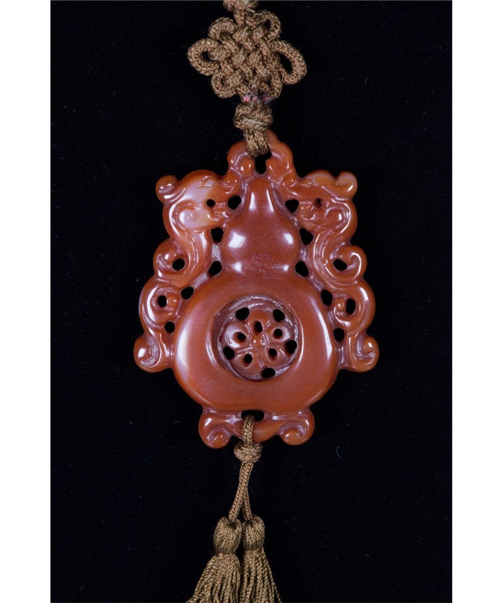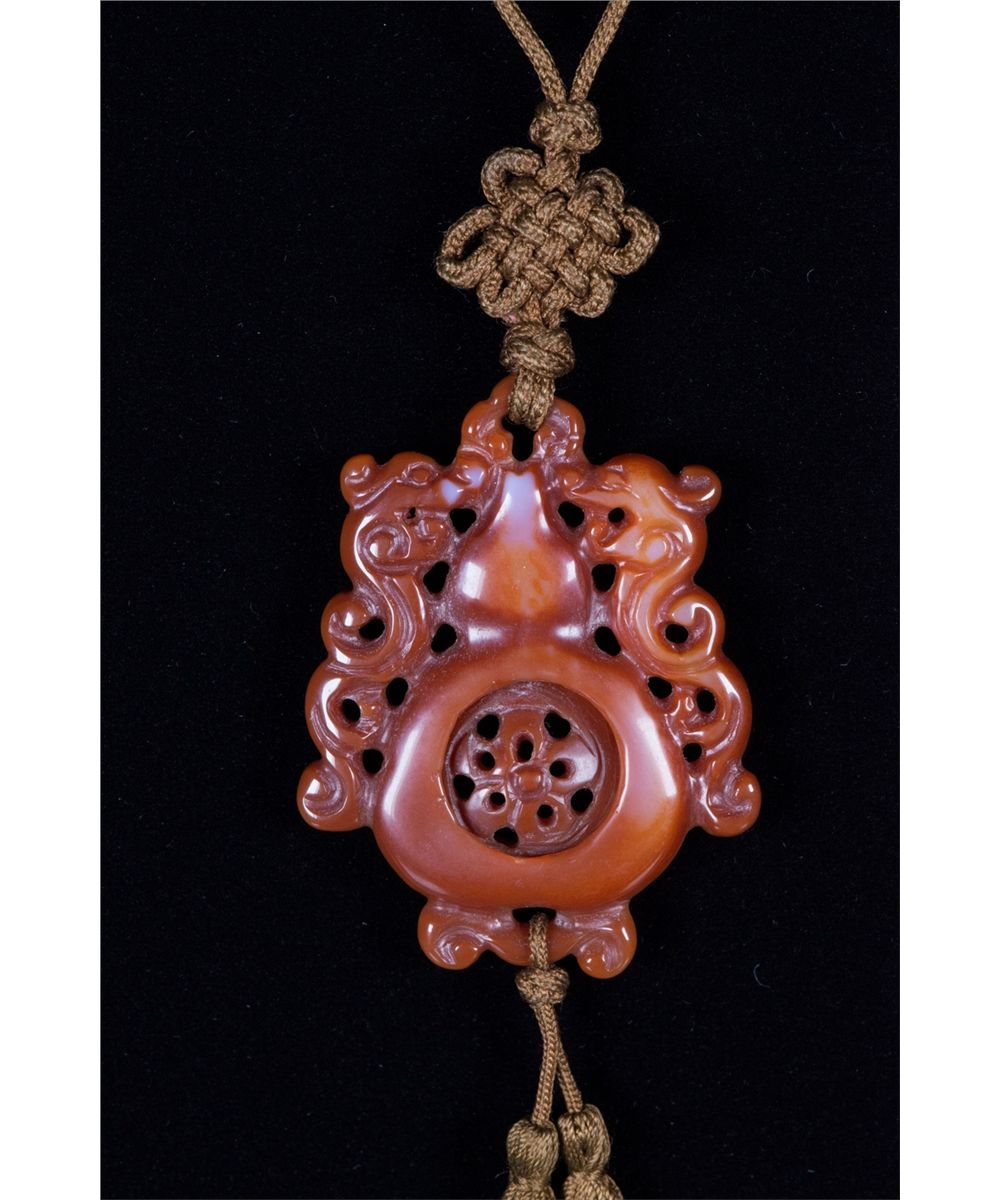 Chinese red agate pendant; featuring calabash and Chilong; H: 6 cm, W: 5 cm, 32 grams