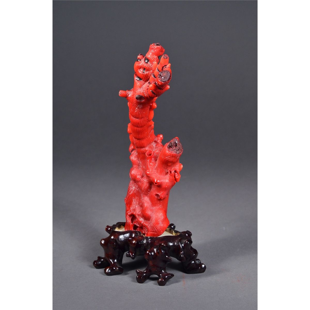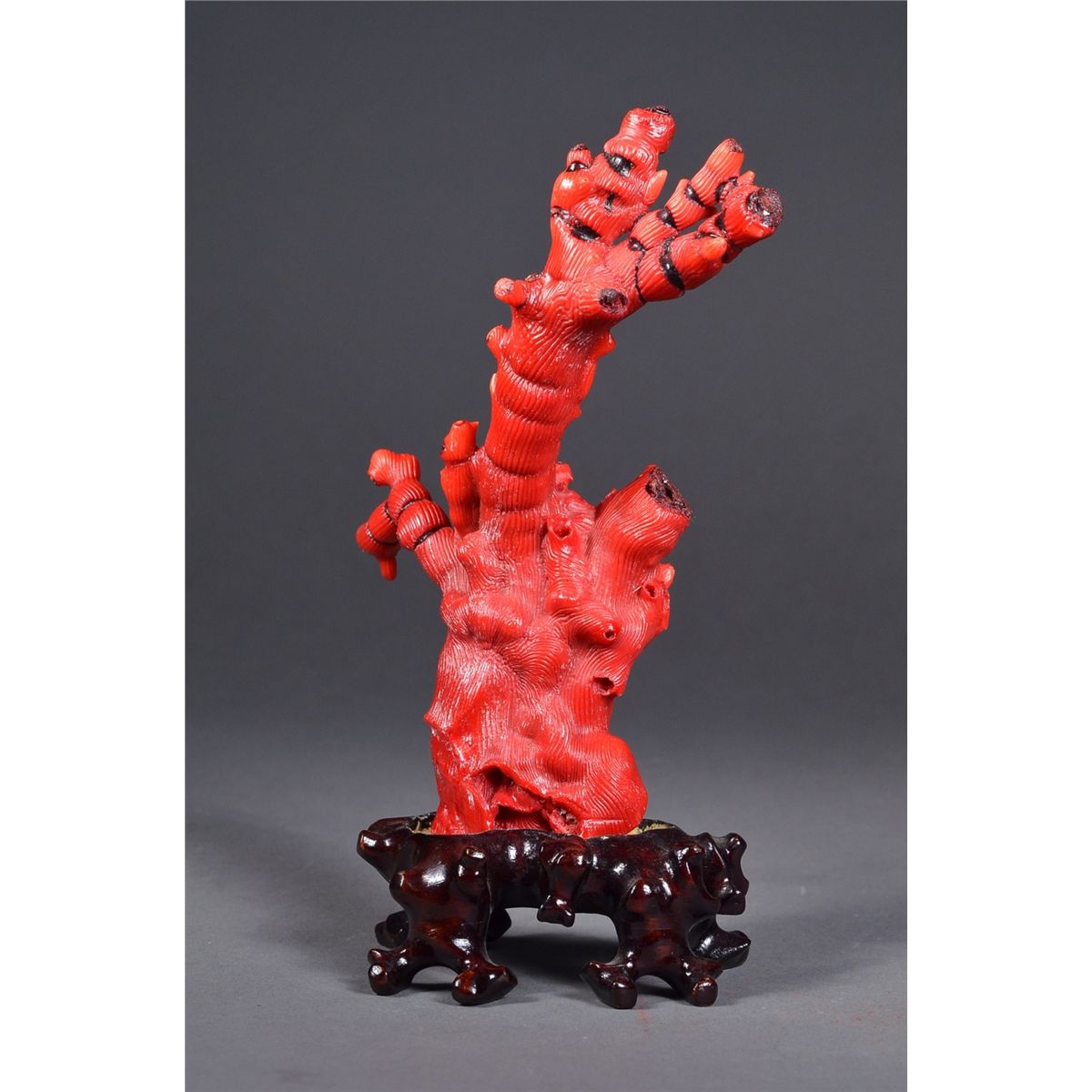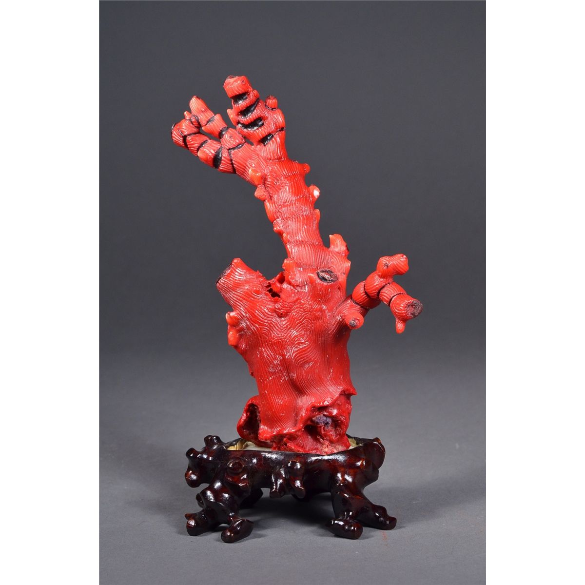 Chinese red coral tree; of naturalistic branch form; H: 14 cm, wood openwork stand