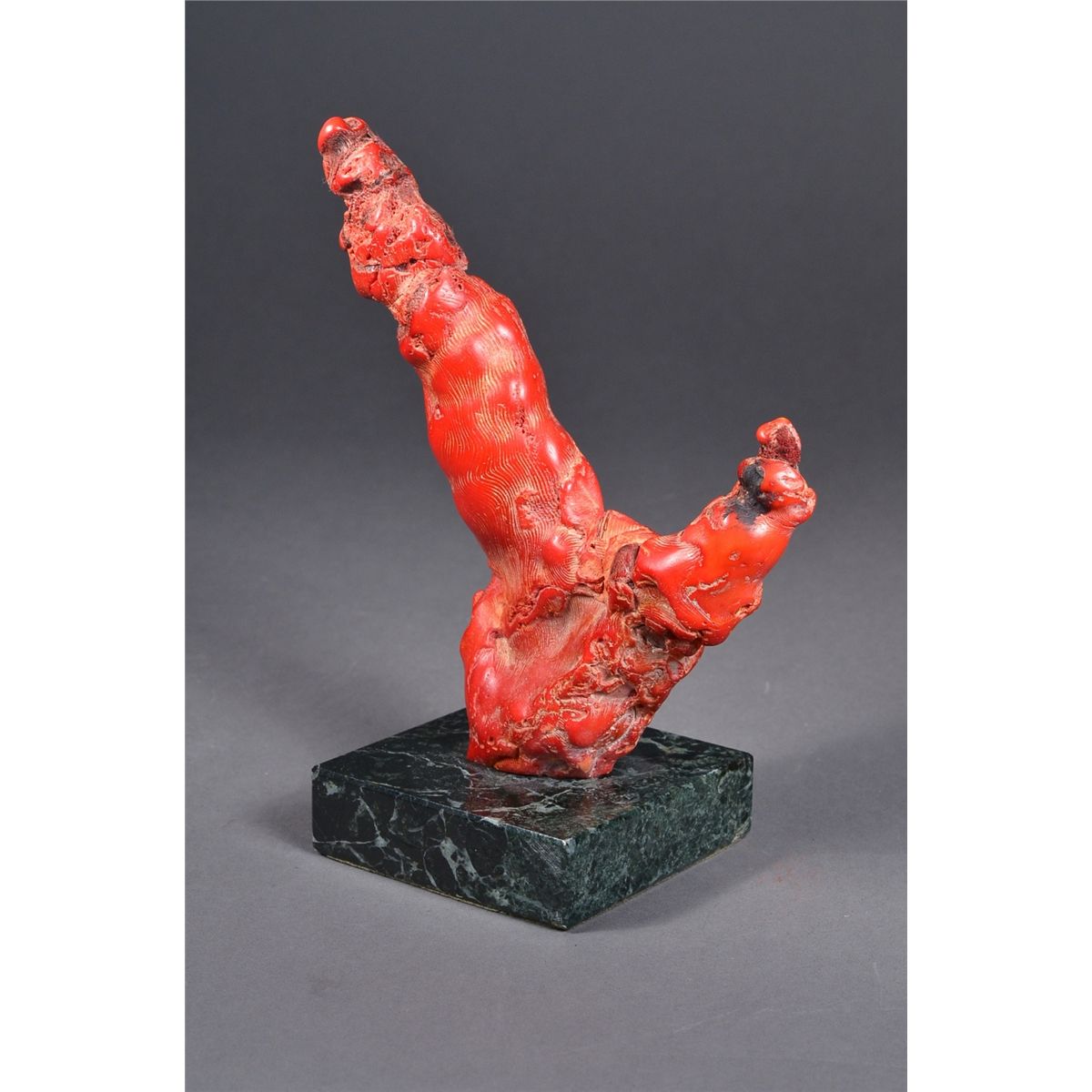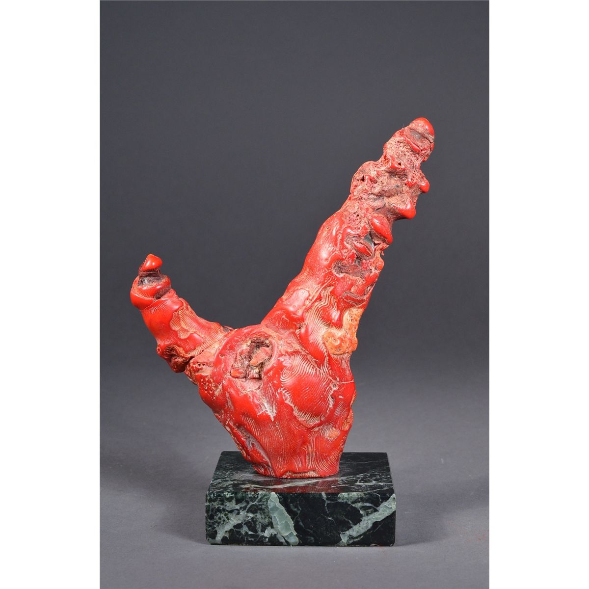 Chinese red coral tree; of naturalistic branch form, mounted on marble rectangular base; H: 15.5 cm